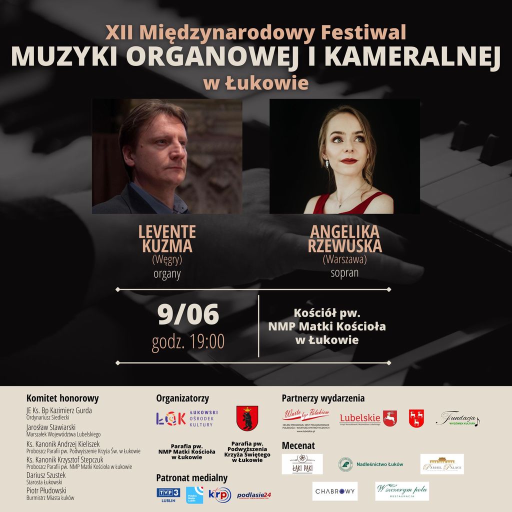 Czwarty koncert XII Międzynarodowego Festiwalu Muzyki Organowej i Kameralnej odbędzie się w niedzielę 9 czerwca o godzinie 19.00 w kościele NMP Matki Kościoła w Łukowie. Wystąpią: Angelika Rzewuska (Warszawa) – sopran oraz Levente Kuzma (Węgry) – organy. Partnerami wydarzenia są: Województwo Lubelskie, Powiat Łukowski oraz Fundacja Wydźwięk Kultury. Wydarzenie bierze udział w Programie „Warto być Polakiem”, którego organizatorem jest Samorząd Województwa Lubelskiego. Celem programu jest pielęgnowanie polskości i wartości patriotycznych przez mieszkańców województwa lubelskiego.Angelika Rzewuska uzyskała dyplom z wyróżnieniem w Szkole Muzycznej II st. im. Fryderyka Chopina w Gdańsku Wrzeszczu w klasie śpiewu solowego dr hab. Liliany Górskiej. W 2020r. ukończyła z wyróżnieniem studia licencjackie na wydziale Wokalno–Aktorskim, kierunek – śpiew solowy, w klasie dr. hab. Anny Fabrello. Podczas studiów otrzymała stypendium Rektora Akademii Muzycznej w Gdańsku przyznawane dla najlepszych studentów. W 2022r. ukończyła z wyróżnieniem studia magisterskie na Uniwersytecie Muzycznym Fryderyka Chopina w Warszawie, specjalizacja – muzyka dawna, w klasie śpiewu solowego prof. Jadwigi Rappé oraz prof. dr Anny Mikołajczyk-Niewiedział. W styczniu 2023r. ukończyła studia magisterskie na Uniwersytecie Warszawskim, kierunek – administracja. Swoje umiejętności wokalne doskonaliła u takich śpiewaków jak: prof. Piotra Łykowskiego, Sofiji Cinguli czy Mariusza Kwietnia. Uczestniczyła także w kursie interpretacji niemieckiej liryki wokalnej, prowadzonym przez Adiego Bara. Brała udział w spektaklach operowych realizowanych przez Akademię Muzyczną w Gdańsku, m.in. kreowała rolę w operze „Dydona i Eneasz”, H. Purcell‘a oraz wystąpiła jako Hiacynt w operze „Apollo i Hiacynt” W. A. Mozarta. W 2022 r. brała udział w wystawianej w UMFC w Warszawie Brockes-Passion HWV 48 Georga Friedricha Haendla, wykonując partię Gläubige Seele pod dyrekcją prof. dr hab. Krzysztofa Kusiel-Moroza. W tym samym roku wykonywała z orkiestrą Filharmonii Koszalińskiej „Mszę Dziecięcą” Johna Ruttera. Angelika Rzewuska koncertowała na międzynarodowych festiwalach w Polsce, na Słowacji, we Włoszech, w Stanach Zjednoczonych oraz w Niemczech.