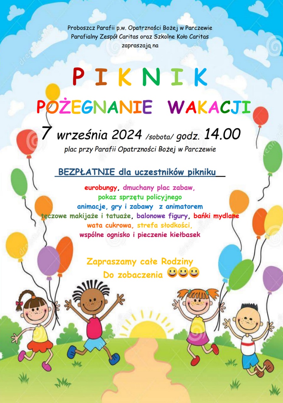 W sobotę, 7 września o godzinie 14.00 na placu przy parafii Opatrzności Bożej w Parczewie odbędzie się Piknik Parafialny ,,Pożegnanie wakacji”. Organizatorzy przewidują wiele atrakcji dla całych rodzin.
