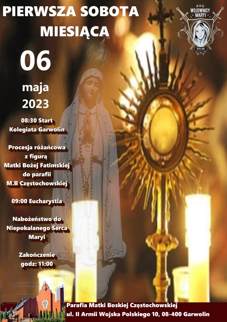 Procesja różańcowa z figurą Matki Bożej Fatimskiej wyruszy o 8:30 sprzed kolegiaty Przemienienia Pańskiego i podążać będzie ulicami miasta do parafii MB Częstochowskiej, gdzie o 9:00 odprawiona zostanie Eucharystia oraz nabożeństwo do Niepokalanego Serca Maryi.Planowane zakończenie o godzinie 11:00.
