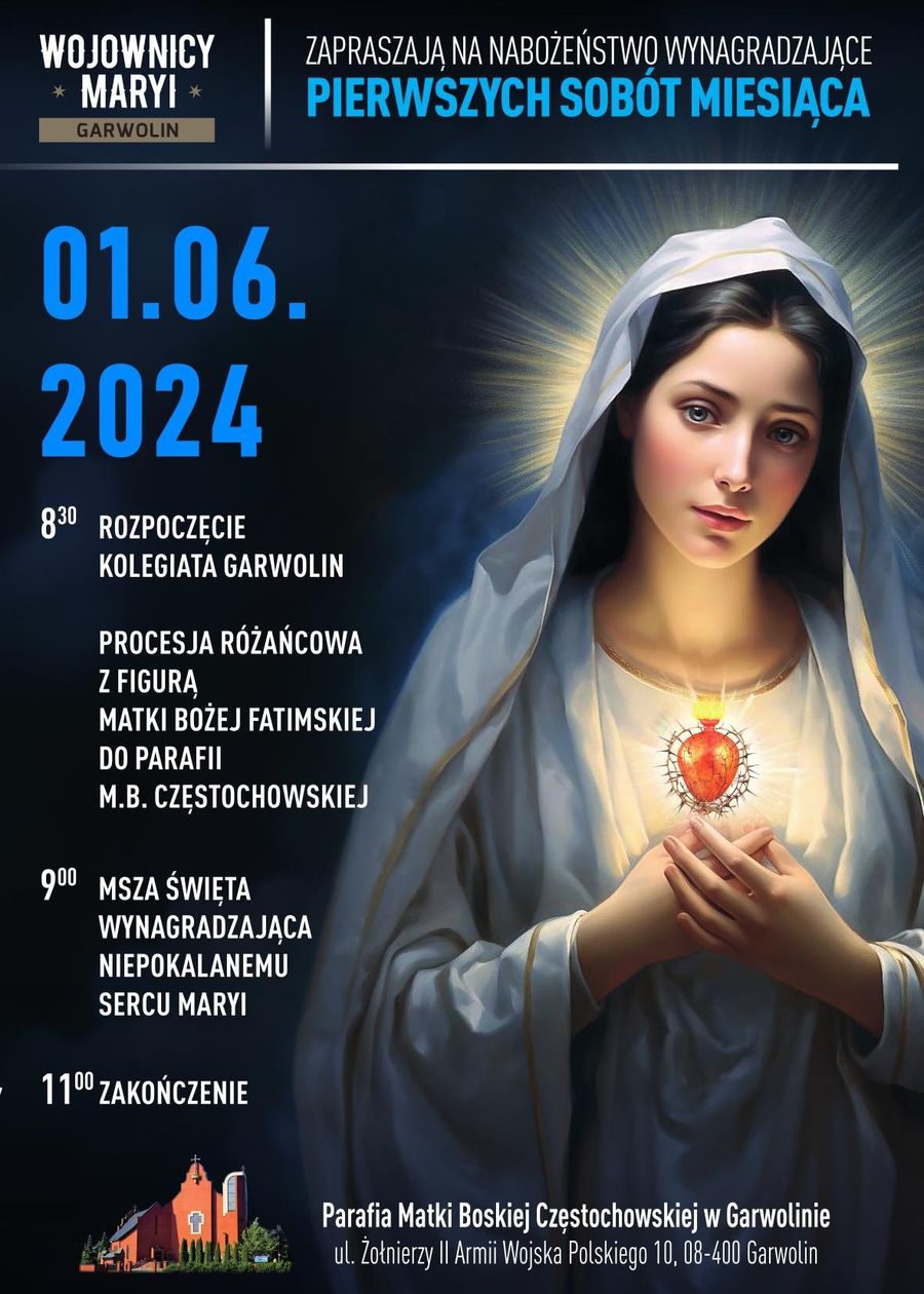 1 czerwca odbędzie się w Garwolinie Publiczny Różaniec prowadzony przez Wojowników Maryi. Organizatorzy zapraszają całe rodziny do tej szczególnej modlitwy wynagradzającej w duchu nabożeństw pierwszych sobót miesiąca.