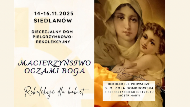 „Macierzyństwo oczami Boga” to temat wyjątkowych rekolekcji dla kobiet, które odbędą się w dniach 14–16 listopada w Domu Rekolekcyjnym w Siedlanowie. Spotkanie poprowadzi siostra Zoja Dombrowska.