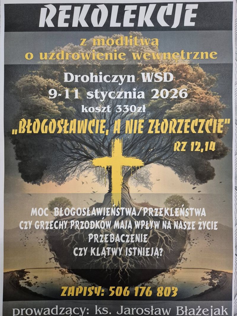 W dniach 9–11 stycznia 2026 r. (piątek–niedziela) w Wyższym Seminarium Duchownym w Drohiczynie odbędą się rekolekcje z modlitwą o uzdrowienie wewnętrzne.Wspólnej modlitwie oraz pogłębianiu życia duchowego towarzyszyć będą słowa z Listu do Rzymian: „Błogosławcie, a nie złorzeczcie” (Rz 12,14).