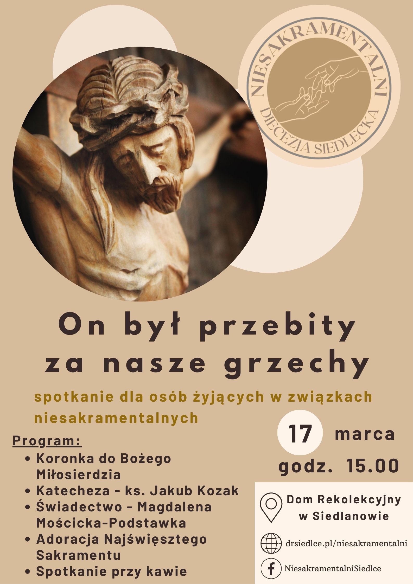 Spotkanie rozpocznie się o godz. 15.00 Koronką do Bożego Miłosierdzia. Następnie będzie miała miejsce konferencja, którą wygłosi ks. Jakub Kozak, diecezjalny duszpasterz osób żyjących w związkach niesakramentalnych. Będzie ona poświęcona zagadnieniu grzechu w życiu człowieka i reakcji Pana Boga na grzech. Świadectwo nawrócenia wygłosi pani Magdalena Mościcka-Podstawka, po czym będzie miała miejsce Adoracja Najświętszego Sakramentu i modlitwa osobista i wspólnotowa. Spotkanie zakończy się spotkaniem przy kawie i ciastku oraz będzie okazja do osobistego spotkania z duszpasterzem.Spotkania dla osób żyjących w związkach niesakramentalnych odbywają się w diecezji siedleckiej w każdą trzecią niedzielę miesiąca w Domu Rekolekcyjnym w Siedlanowie o godz. 15.00. Na spotkania zaprasza diecezjalny duszpasterz - ks. Jakub Kozak.