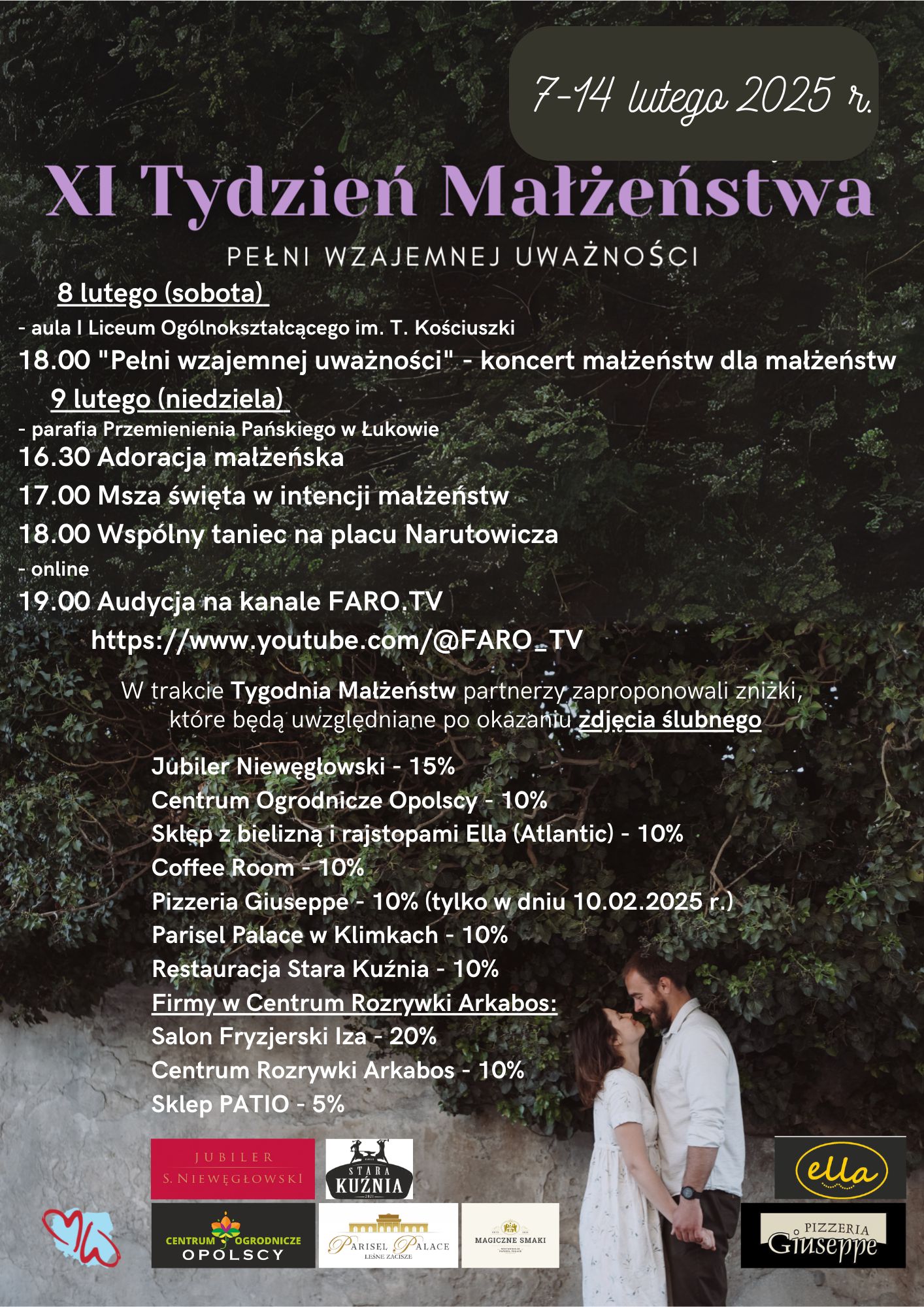 Obchody Tygodnia Małżeństwa będą odbywać się w Łukowie po raz pierwszy. Potrwają dwa dni, w sobotę i w niedzielę 8 i 9 lutego. W sobotnie popołudnie odbędzie się koncert „Pełni Wzajemnej Uważności”. Wystąpią na nim dwa śpiewające małżeństwa: Barbara i Cezary Kryczkowie oraz Karolina i Piotr Nurzyńscy. Koncert odbędzie się w auli I LO im. T. Kościuszki. Początek godzina 18.00.W niedzielę 9 lutego małżeństwa spotkają się o godzinie 16.30 na adoracji Najświętszego Sakramentu w kościele Przemienienia Pańskiego. O godzinie 17.00 odprawiona zostanie Msza Święta w intencji małżeństw. Po wspólnej modlitwie na Placu Narutowicza odbędzie się wspólny taniec wszystkich par.