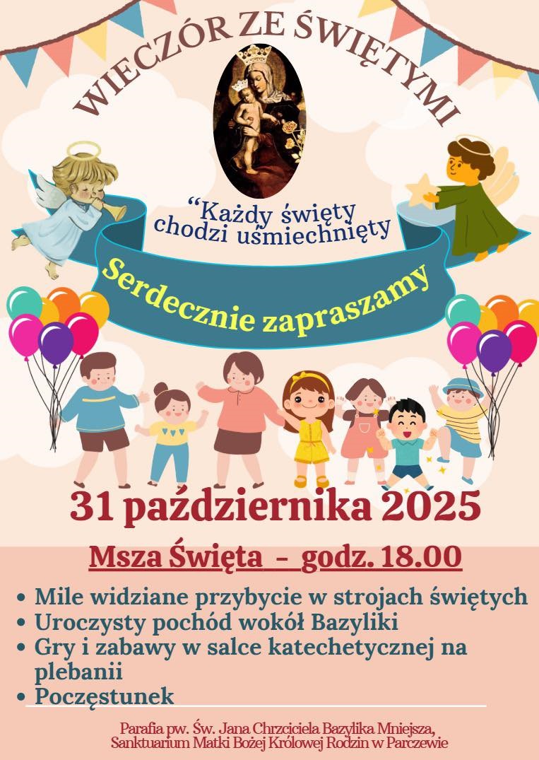 Wydarzenie rozpocznie się wspólną Mszą Świętą o godzinie 18.00. Następnie wszyscy wyruszą na pochód wokół kościoła, a potem do salki katechetycznej przy plebanii. Tam dla dzieci przygotowane zostały zabawy i gry, które będą dotyczyć życia świętych, wspólne śpiewanie piosenek oraz poczęstunek. Organizatorzy zachęcają, aby dzieci i młodzież przyszły przebrane za swoich ulubionych świętych lub błogosławionych.Wieczór ze Świętymi będzie okazją, aby w sposób radosny i duchowy przygotować się do uroczystości Wszystkich Świętych, a jednocześnie przypomnieć sobie, że świętość to powołanie każdego z nas.