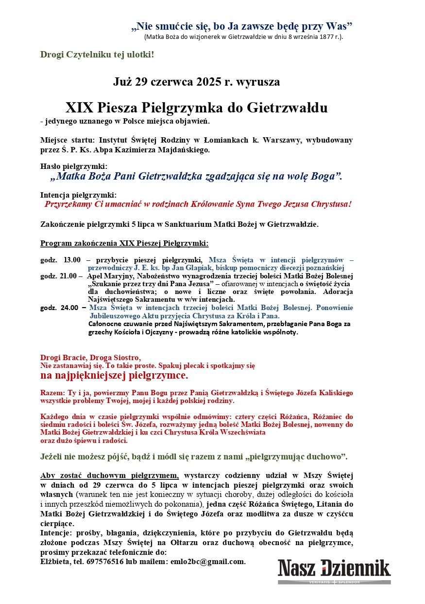 Szczegóły pielgrzymki dostępne są na stronie: www.rozaniec24.pl.