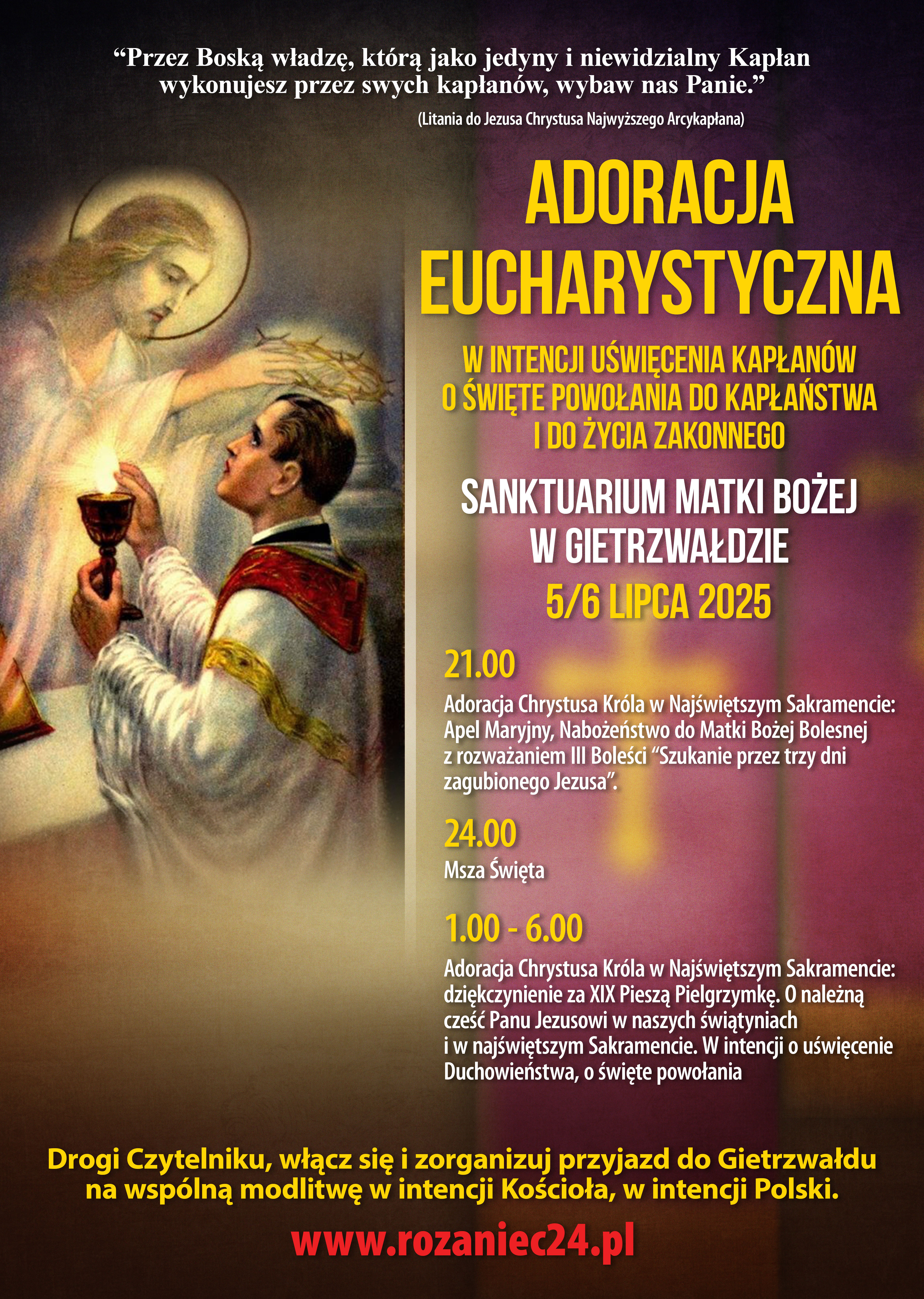 - godz. 21:00–6:00 – nocna adoracja Eucharystyczna, dostępna również online na stronie: www.rozaniec24.pl.
