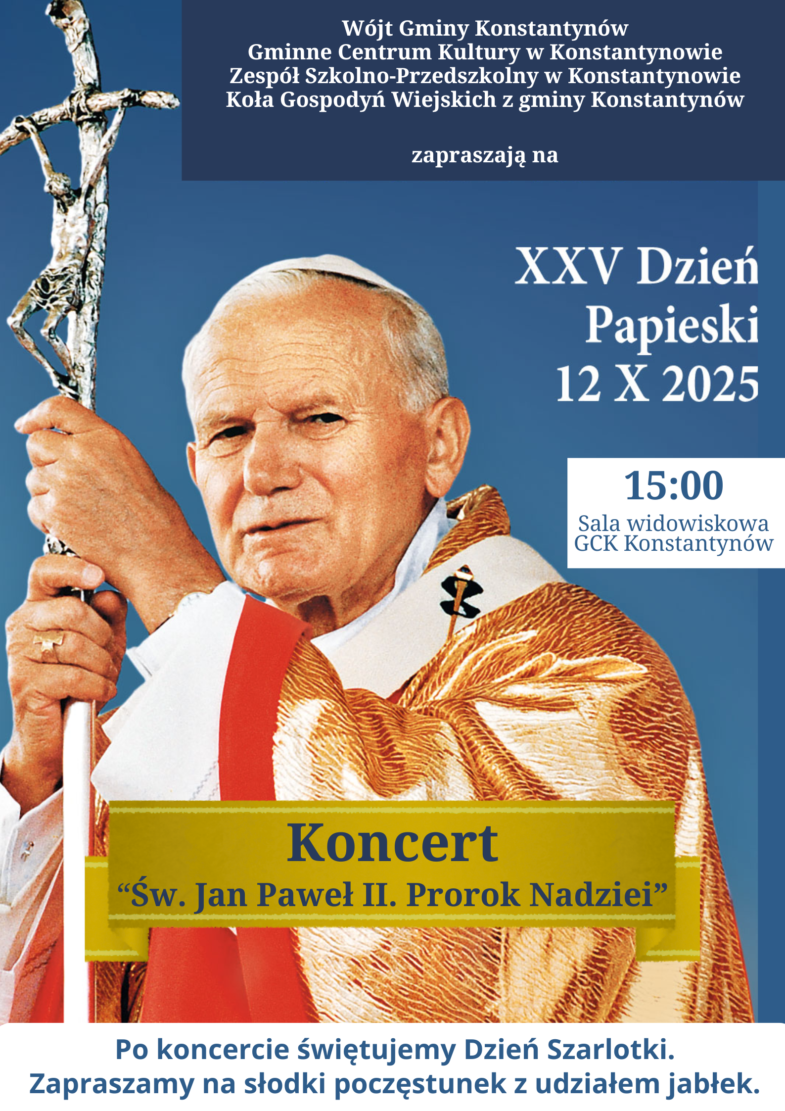 Tegoroczna edycja przebiegać będzie pod hasłem „Jan Paweł II – Prorok Nadziei” i będzie okazją do refleksji nad dziedzictwem duchowym oraz nauczaniem papieża Polaka. Dzień Papieski od lat stanowi przestrzeń do wspólnego upamiętnienia pontyfikatu Jana Pawła II, a także do pielęgnowania wartości, które głosił – takich jak wiara, solidarność, wolność i odpowiedzialność.Organizatorem obchodów jest Gminne Centrum Kultury w Konstantynowie.