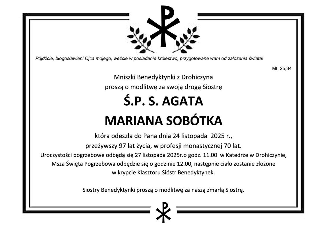 Do Domu Ojca odeszła siostra Agata Marianna Sobótka, Mniszka Benedyktynka z Drohiczyna. Zmarła 24 listopada, miała 97 lat. W profesji monastycznej przeżyła 70 lat.