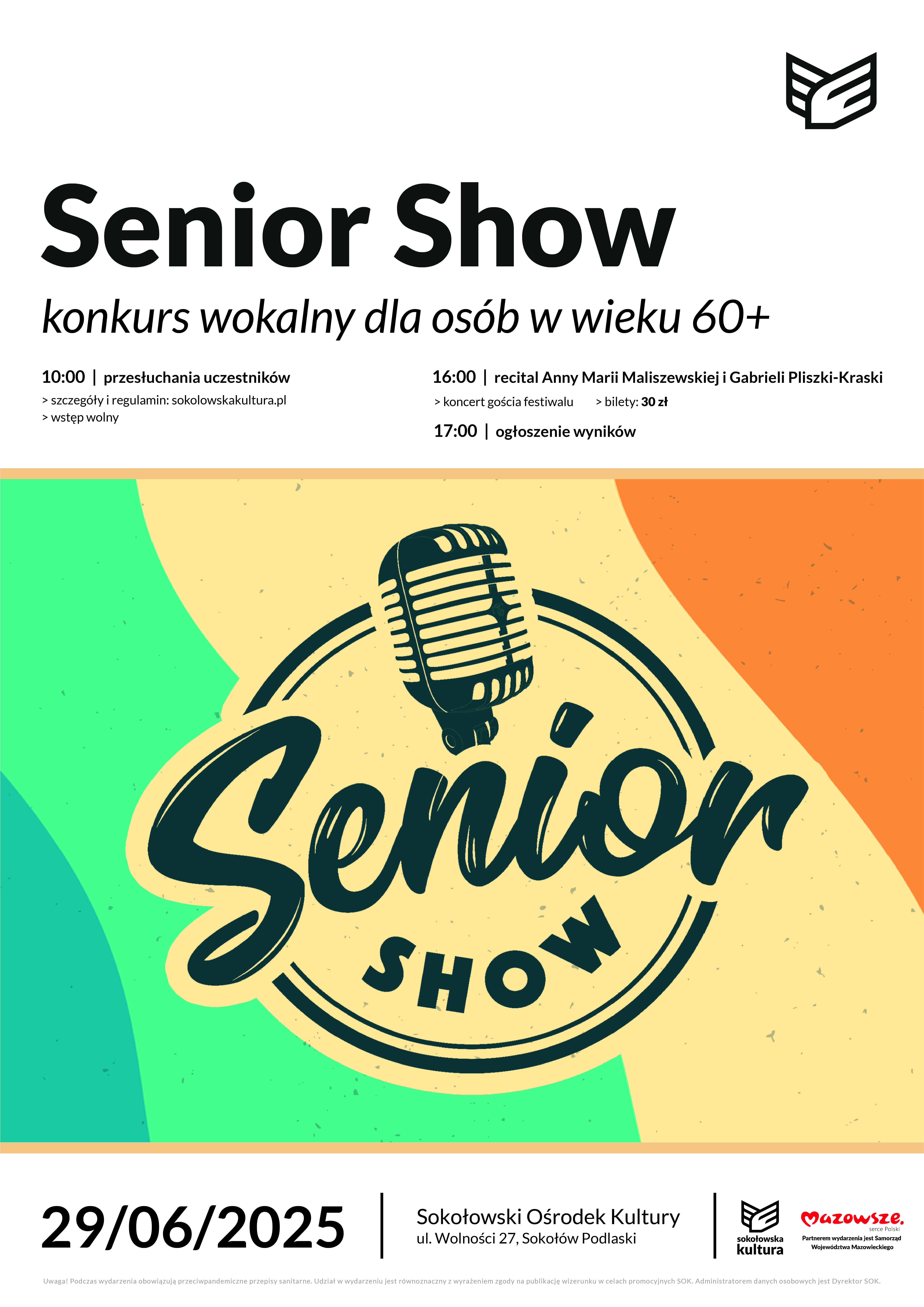 Sokołowski Ośrodek Kultury zaprasza wszystkich seniorów, którzy kochają muzykę i śpiew, do udziału w wyjątkowym wydarzeniu – jubileuszowej, piątej edycji Senior Show! Konkurs odbędzie się 29 czerwca 2025 roku w Sokołowskim Ośrodku Kultury.