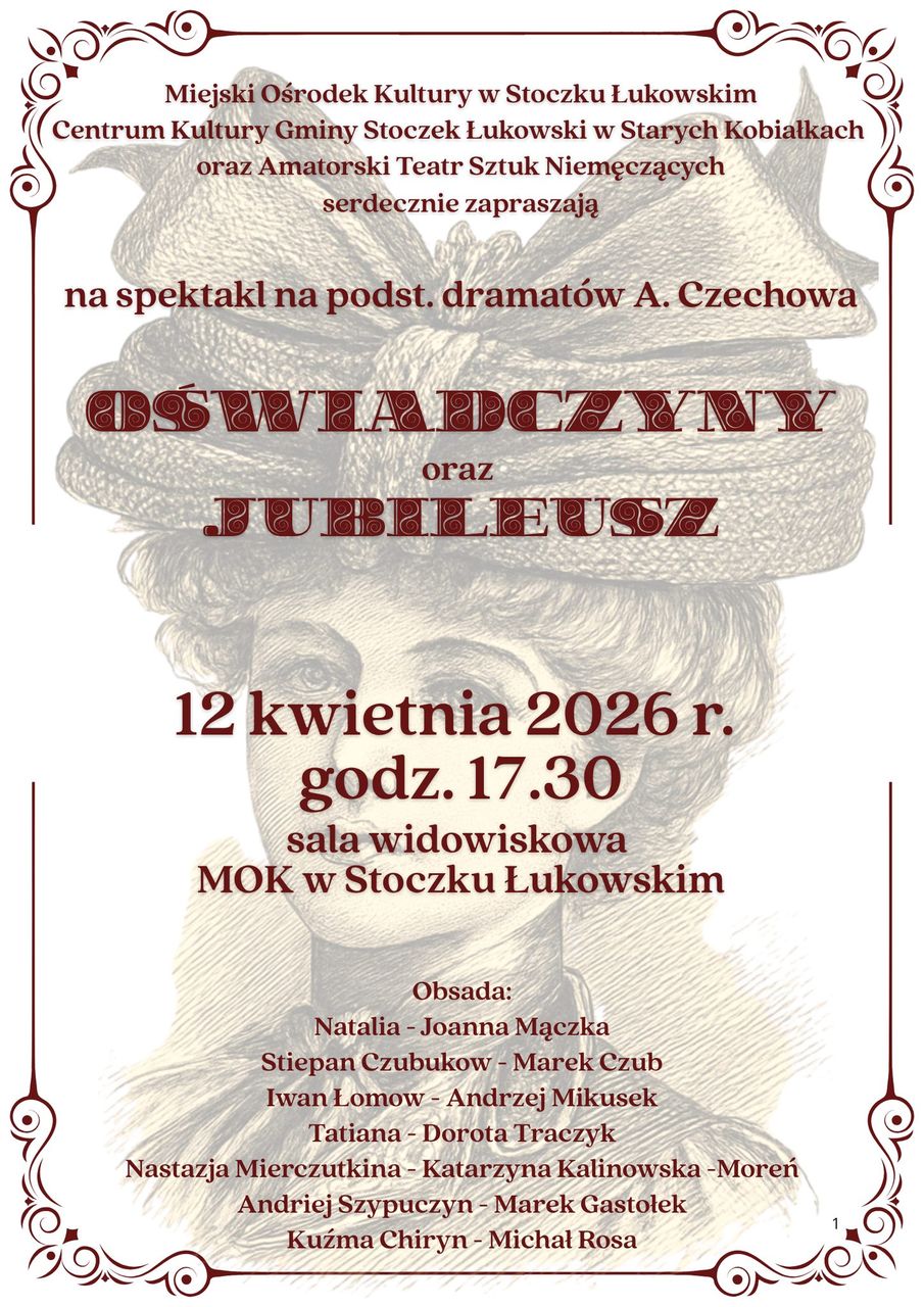 Spektakl przygotowany przez Amatorski Teatr Sztuk Niemęczących „Odskocznia” wystawiany był już dwukrotnie na scenie Centrum Kultury i Gminnej Biblioteki Publicznej w Starych Kobiałkach. Po raz trzeci będzie można go zobaczyć w najbliższą niedzielę, 12 kwietnia w Miejskim Ośrodku Kultury w Stoczku Łukowskim. Początek godzina 17:30.W rolach głównych wystąpią: