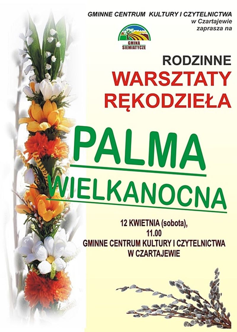Rodzinne warsztaty rękodzielnicze pod hasłem „Palma Wielkanocna” odbędą się w sobotę, 12 kwietnia, w Gminnym Centrum Kultury i Czytelnictwa w Czartajewie (to nowy, wielofunkcyjny budynek w miejscu dawnej świetlicy). Organizatorzy zapewniają materiały i zapowiadają wykonanie wielu palm – w tym kilku większych, mierzących od 2 do 3 metrów.Warsztaty rozpoczną się o godz. 11.00.