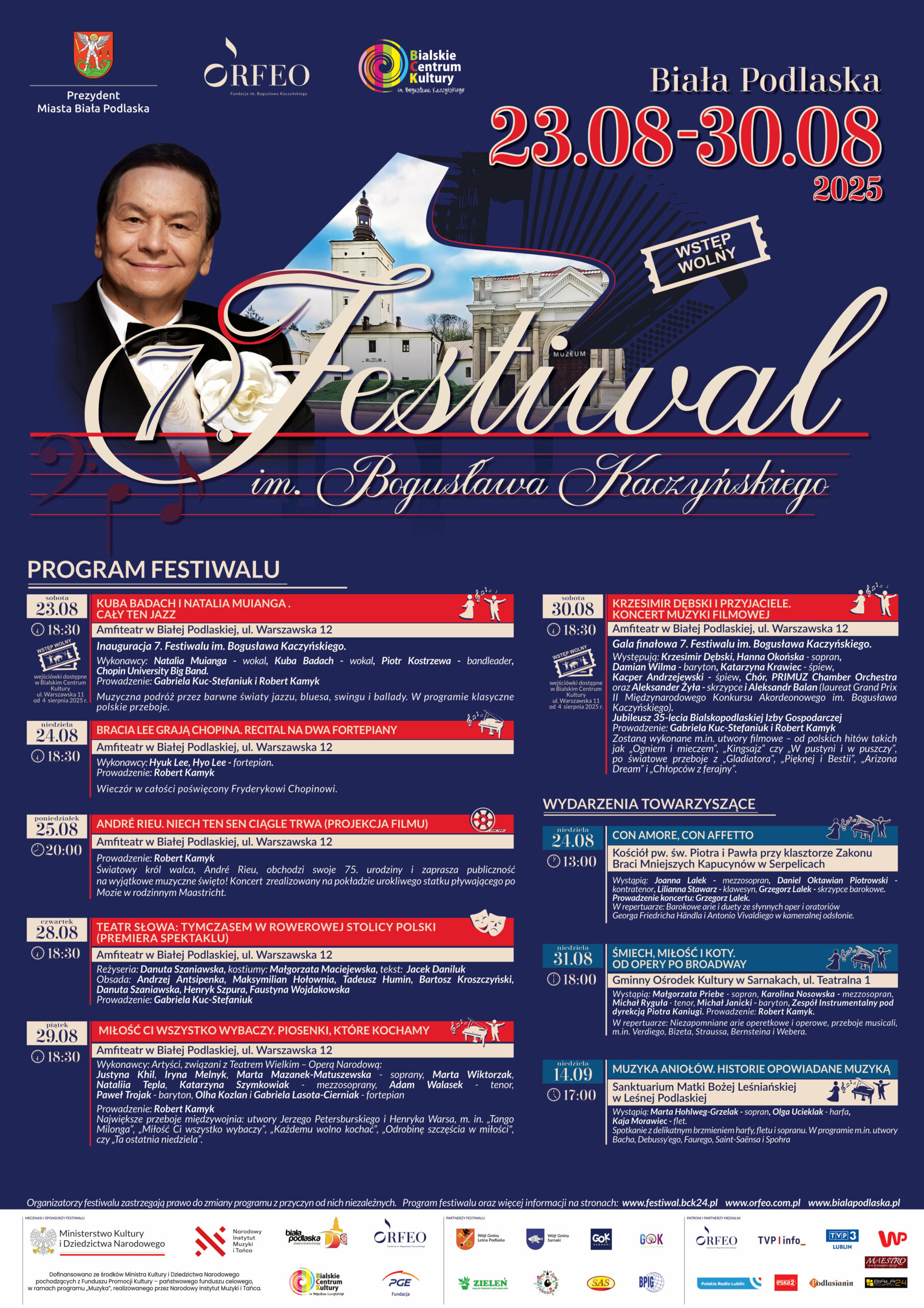 W dniach 23–30 sierpnia 2025 roku Biała Podlaska ponownie stanie się stolicą muzyki – wszystko za sprawą 7. Festiwalu im. Bogusława Kaczyńskiego. Przez tydzień mieszkańcy i goście miasta będą mogli uczestniczyć w koncertach, spektaklach oraz wydarzeniach towarzyszących – a wszystko to z bezpłatnym wstępem!