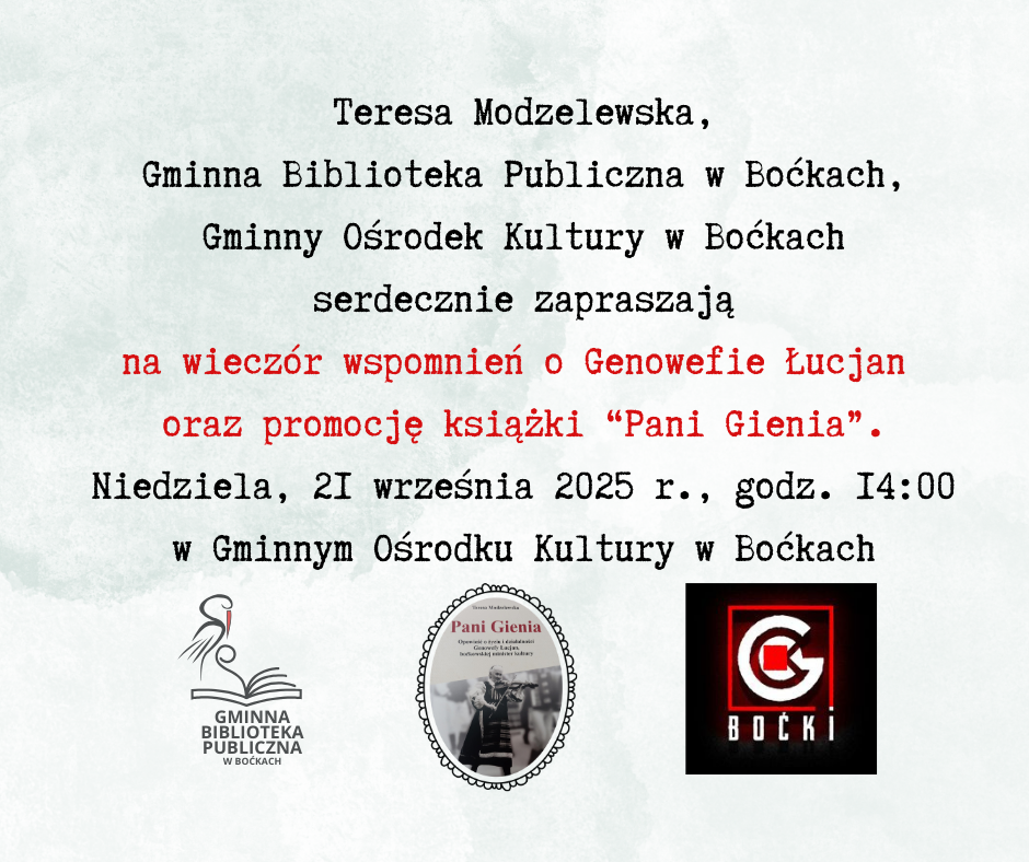 W niedzielę, 21 września, odbędzie się spotkanie autorskie promujące książkę. Jak zapowiadają organizatorzy, ma to być popołudnie pełne wspomnień o pani Gieni. Spotkanie zaplanowano na godzinę 14:00 w Gminnym Ośrodku Kultury w Boćkach. W programie m.in. fragmenty filmów z lat 80. XX wieku z bohaterką książki w roli głównej, a w pozostałych rolach – ludzie tworzący społeczność boćkowską tamtych lat.