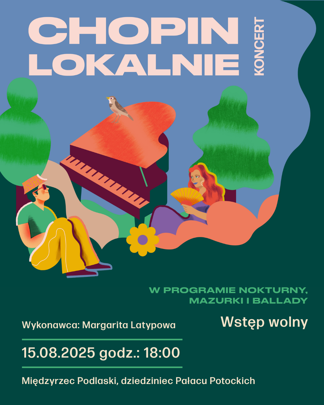Nokturny, mazurki i ballady Fryderyka Chopina będzie można usłyszeć na dziedzińcu Pałacu Potockich. Wystąpi Margarita Latypowa. Kameralny koncert chopinowski w Parku Potockich w Międzyrzecu Podlaskim odbędzie się 15 sierpnia. Rozpocznie się o godz. 18:00. Wstęp wolny. To spotkanie z muzyką klasyczną jest częścią projektu realizowanego przez Narodowe Centrum Kultury we współpracy z Uniwersytetem Muzycznym Fryderyka Chopina.