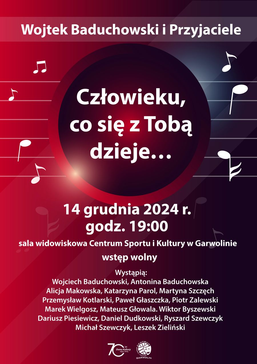 Dobrze mieć przyjaciół, a jeszcze lepiej, kiedy można z nimi dzielić wspólną pasję. Gdy tą pasją jest muzyka, wychodzi z tego coś zupełnie niebanalnego. Tak właśnie jest z koncertami Wojtka Baduchowskiego i jego przyjaciół. To nie tylko przeżycie muzyczne w dobrej atmosferze, to także sala wypełniona publicznością, która czuje i śpiewa razem z artystami, to momenty nostalgii i wzruszeń a czasem spontanicznego śmiechu.Na tegoroczny koncert zatytułowany: „Człowieku co się z Tobą dzieje...” będą składały się utwory klasyków polskiej i światowej muzyki rockowej, w tym wykonawców którzy już odeszli, a ich utwory okazały się ponadczasowe swoim brzmieniem i treścią. Tytuł koncertu zaczerpnięto z tekstu piosenki Ryszarda Ridla, która ma skłonić do refleksji nad tym, co dzieje się na co dzień wokół nas.