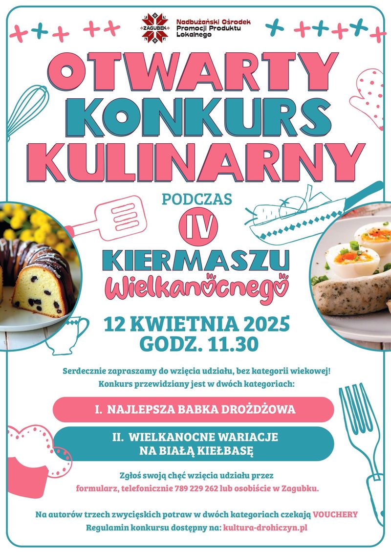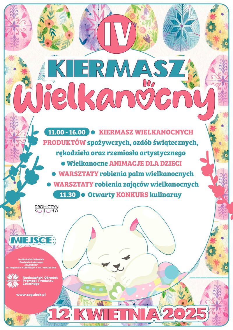 Podczas Kiermaszu odbędzie się konkurs kulinarny nawiązujący do tradycji wielkanocnego stołu. Dodatkowo, z prelekcją na temat zwyczajów wielkanocnych na Podlasiu wystąpi pracownik Muzeum Rolnictwa w Ciechanowcu.Kiermasz Wielkanocny odbędzie się w Nadbużańskim Ośrodku Promocji Produktu Lokalnego „Zagubek” (ul. Targowa 1 w Drohiczynie) w sobotę, 12 kwietnia. Początek o godz. 11:00.