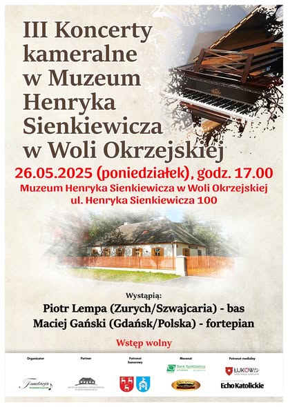 Artystyczne spotkanie w Muzeum Henryka Sienkiewicza w Woli Okrzejskiej z okazji Dnia Matki odbędzie się 26 maja. Wystąpią na nim solista Piotr Lempa ze Szwajcarii, któremu akompaniować będzie na fortepianie Maciej Gański z Gdańska. Muzycznej uczcie będzie towarzyszyć wernisaż wystawy prac malarskich Aliny Pięty oraz Magdaleny Skwarek. Malarki zaprezentują obrazy inspirowane ekranizacjami dzieł Henryka Sienkiewicza.Spotkanie z okazji Dnia Matki w muzeum w Woli Okrzejskiej rozpocznie się o godzinie 17:00.