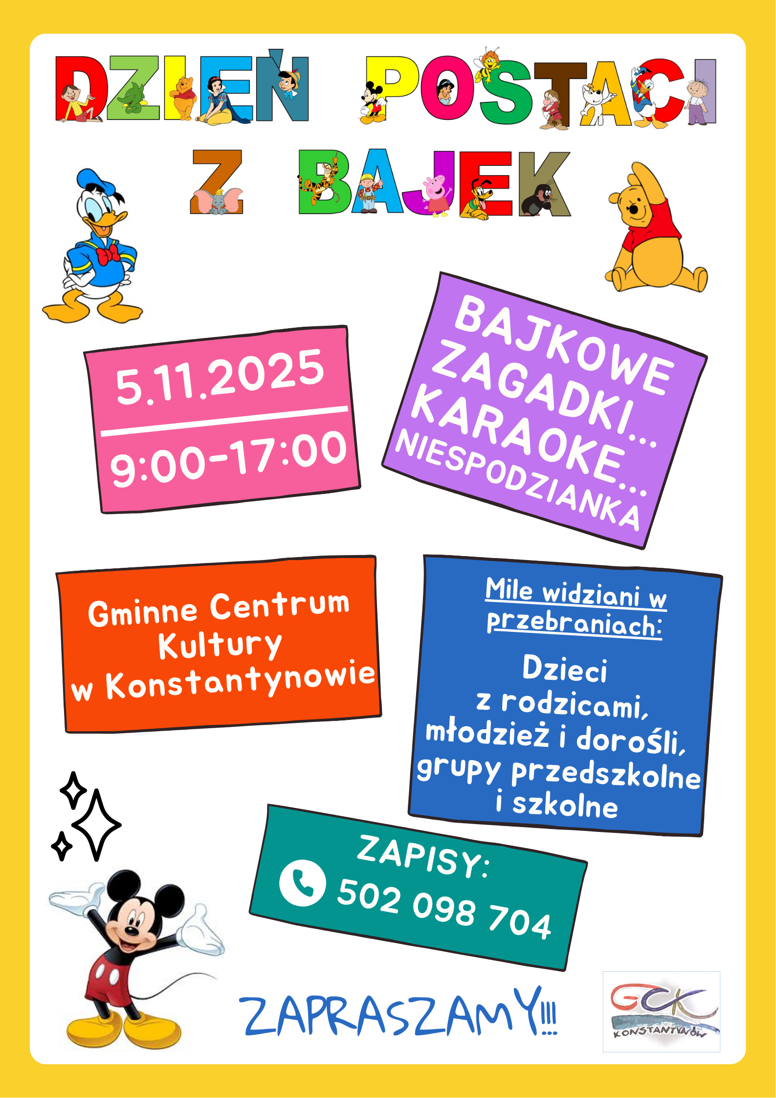 Bajkowy klimat, barwne przebrania i mnóstwo atrakcji – tak zapowiada się Dzień Postaci z Bajek, który 5 listopada odbędzie się w Gminnym Centrum Kultury w Konstantynowie. W programie przewidziano rozrywkę dla całych rodzin, a także dla zorganizowanych grup szkolnych i przedszkolnych.