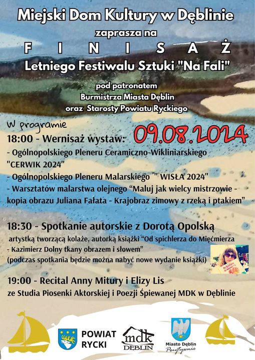W piątek, 9 sierpnia w Miejskim Domu Kultury w Dęblinie o godzinie 18:00 odbędzie się Finisaż Letniego Festiwalu Sztuki „Na Fali”. W planie wernisaże, spotkanie autorskie oraz recital.