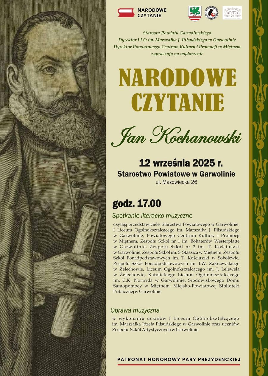 W dosyć oryginalny sposób garwolińskie Starostwo Powiatowe zaprasza na Narodowe Czytanie poezji Jana Kochanowskiego. Wybrane fraszki, pieśni i treny czytać będzie 12 września zaproszona młodzież, samorządowcy, pracownicy biblioteki oraz podopieczni miętneńskiego ŚDS. Zaplanowano również odpowiednią oprawę muzyczną.