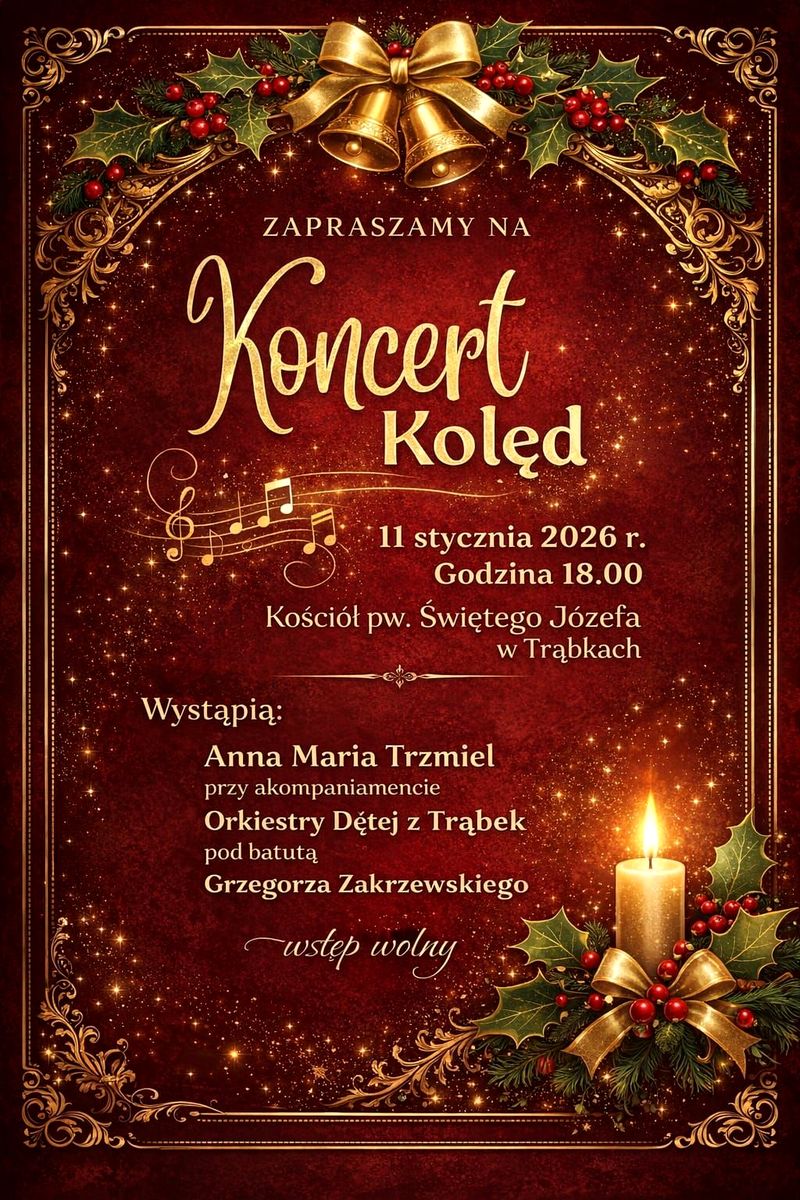11 stycznia orkiestra pod batutą Grzegorza Zakrzewskiego i wokalistka Anna Maria Trzmiel przeniosą słuchaczy w niezwykły klimat Betlejemskiej Nocy – pełen radości, ciepła i zadumy. W programie koncertu, który odbędzie się o godz. 18:00 w kosciele pw. św. Józefa w Trąbkach, m.in. piękne aranżacje kolęd „Wśród nocnej ciszy”, „O Gwiazdo Betlejemska” oraz pełne radości „Dzisiaj w Betlejem”.Niech ten wieczór stanie się okazją do wspólnego kolędowania i przedłużenia świątecznej atmosfery.