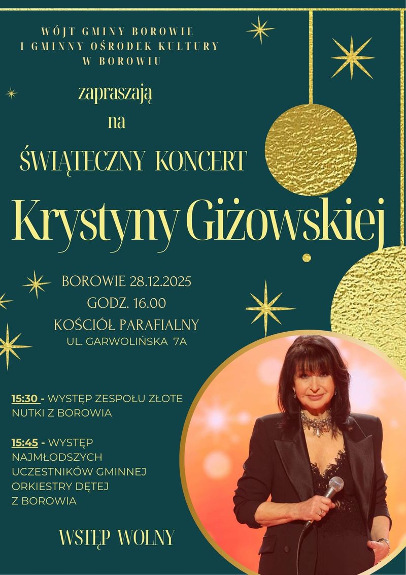 Już 28 grudnia o godz. 16:00 w kościele parafialnym w Borowiu odbędzie się świąteczny koncert kolęd w wykonaniu Krystyny Giżowskiej. Artystka, znana z niezwykłej wrażliwości i energii scenicznej, po raz kolejny zaprosi publiczność do wspólnego przeżywania bożonarodzeniowej atmosfery.Koncert wzbogacą występy dziecięcego zespołu Złote Nutki oraz najmłodszych muzyków Gminnej Orkiestry Dętej z Borowia, którzy razem z artystką stworzą pełną ciepła i wzruszeń oprawę muzyczną.