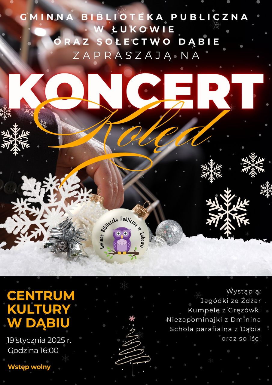 Koncert Kolęd w Centrum Kultury w Dąbiu będzie okazją do wysłuchania kolęd w wykonaniu „Jagódek” ze Żdżar, „Kumpeli” z Gręzówki oraz „Niezapominajek” z Dminina. 19 stycznia wystąpią również soliści oraz schola z parafii Matki Bożej Królowej Polskiej w Dąbiu. Początek koncertu o godzinie 16.00.Koncert organizuje Gminna Biblioteka Publiczna oraz sołectwo Dąbie. Wstęp wolny.