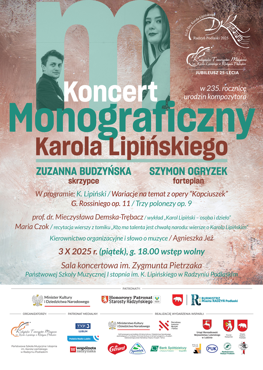 W bieżącym roku przypada 235. rocznica urodzin wybitnego radzynianina. Z tej okazji Radzyńskie Towarzystwo Muzyczne i Państwowa Szkoła Muzyczna I stopnia w Radzyniu Podlaskim postanowiły uczcić pamięć wspólnego patrona wieczorem poetycko-muzycznym, podczas którego prof. dr. Mieczysława Demska-Trębacz (prof. emeryt. Uniwersytetu Muzycznego F. Chopina w Warszawie, muzykolog, autorka licznych publikacji naukowych) wygłosi wykład zatytułowany „Karol Lipiński – osoba i dzieło”.Utwory kompozytora – Wariacje na temat z opery "Kopciuszek" G. Rossiniego op. 11 oraz 3 polonezy op. 9 (nr 1 A-dur, nr 2 e-moll i nr 3 D-dur) w opracowaniu Piotra Wróbla – wykonają: radzynianka Zuzanna Budzyńska – skrzypce i Szymon Ogryzek – fortepian. Duet powstał w 2017 roku – wówczas nagrali swoją pierwszą płytę prezentującą siedem najpiękniejszych polonezów na skrzypce i fortepian w twórczości kompozytorów polskich, a wśród nich utwory Karola Lipińskiego. Laureaci nagrody Koryfeusz Muzyki Polskiej 2019 w kategorii „Odkrycie Roku”, zostali określeni przez portal Era Jazzu jako „perfekcyjny duet”. Ukończyli Uniwersytet Muzyczny F. Chopina w Warszawie, a obecnie studiują na Uniwersytecie Muzycznym w Wiedniu.