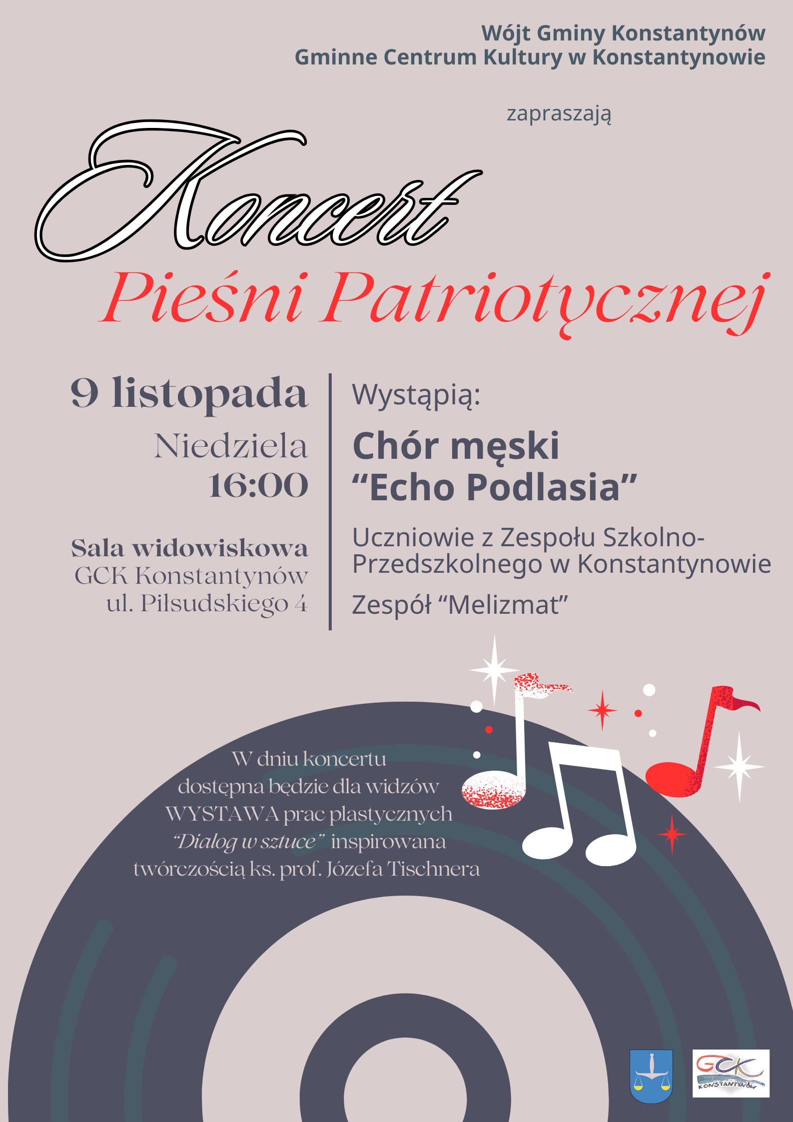 Na scenie wystąpi chór męski „Echo Podlasia”, uczniowie z Zespołu Szkolno-Przedszkolnego w Konstantynowie oraz zespół „Melizmat”. Repertuar wypełnią utwory, które przypomną o znaczeniu wolności, tożsamości i wspólnoty.Dodatkowo dla publiczności udostępniona zostanie wystawa prac plastycznych „Dialog w sztuce”, inspirowana twórczością ks. prof. Józefa Tischnera.