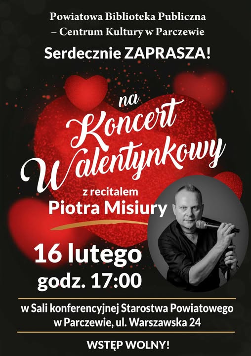 - Już po raz kolejny nasza biblioteka organizuje koncert walentynkowy. W romantyczną podróż po muzycznym świecie zabierze mieszkańców Parczewa i powiatu parczewskiego Piotr Misiura, utalentowany solista z Włodawy. To właśnie muzyka jest jednym z najlepszych sposobów ukazania pięknych, a czasem trudnych historii miłosnych. Nie zabraknie wzruszających utworów opowiadających o miłości i atmosfery pełnej ciepłych uczuć – mówi Ewelina Szymańska, p.o. dyrektora Powiatowej Biblioteki Publicznej - Centrum Kultury w Parczewie.Koncert odbędzie się w niedzielę, 16 lutego, o godzinie 17:00 w sali konferencyjnej Starostwa Powiatowego w Parczewie. Wstęp na wydarzenie jest bezpłatny.