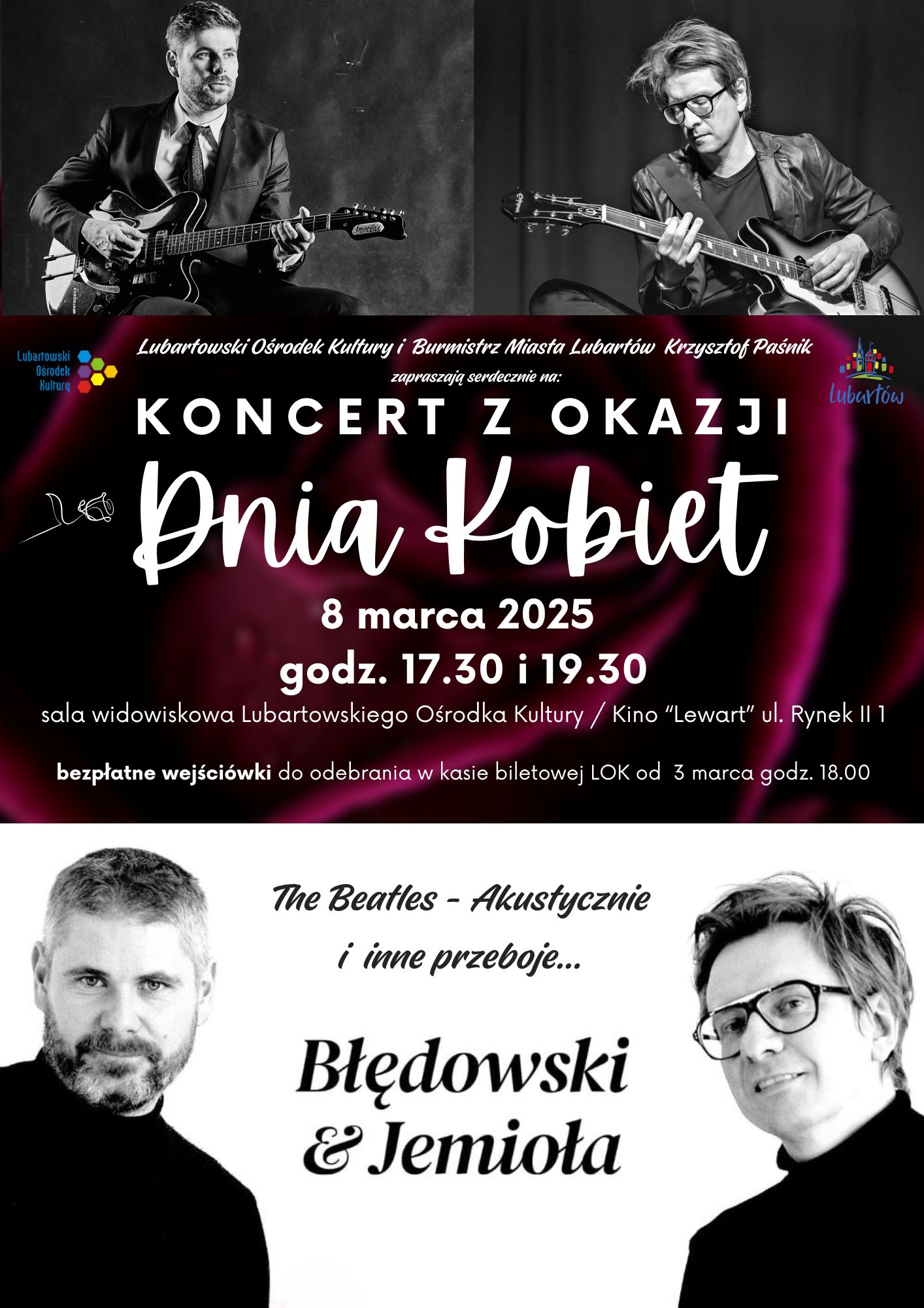W sali widowiskowej Lubartowskiego Ośrodka Kultury zagrają i zaśpiewają dla mieszkanek Lubartowa znakomici lubelscy artyści, duet: Paweł Błędowski i Łukasz Jemioła.