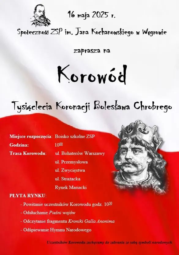 Pieśń średniowiecznych wojów i fragmenty kronika Galla Anonima będą towarzyszyć uczestnikom Korowodu, jaki z okazji tysiąclecia koronacji Bolesława Chrobrego organizuje społeczność Zespołu Szkół Ponadpodstawowych imienia Jana Kochanowskiego w Węgrowie.
