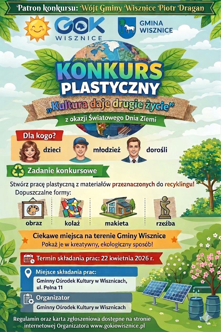 Światowy Dzień Ziemi będziemy obchodzić 22 kwietnia. To okazja do tego, aby przypomnieć, jak ważna jest troska o planetę i codzienne wybory przyjazne środowisku. Ten właśnie cel przyświeca organizatorom konkursu plastycznego pt. ,,Kultura daje drugie życie".Zadanie konkursowe polega na wykonaniu pracy plastycznej dotyczącej ciekawych miejsc w gminie Wisznice (obrazu, makiety, kolażu, rzeźby) z materiałów przeznaczonych do recyklingu.