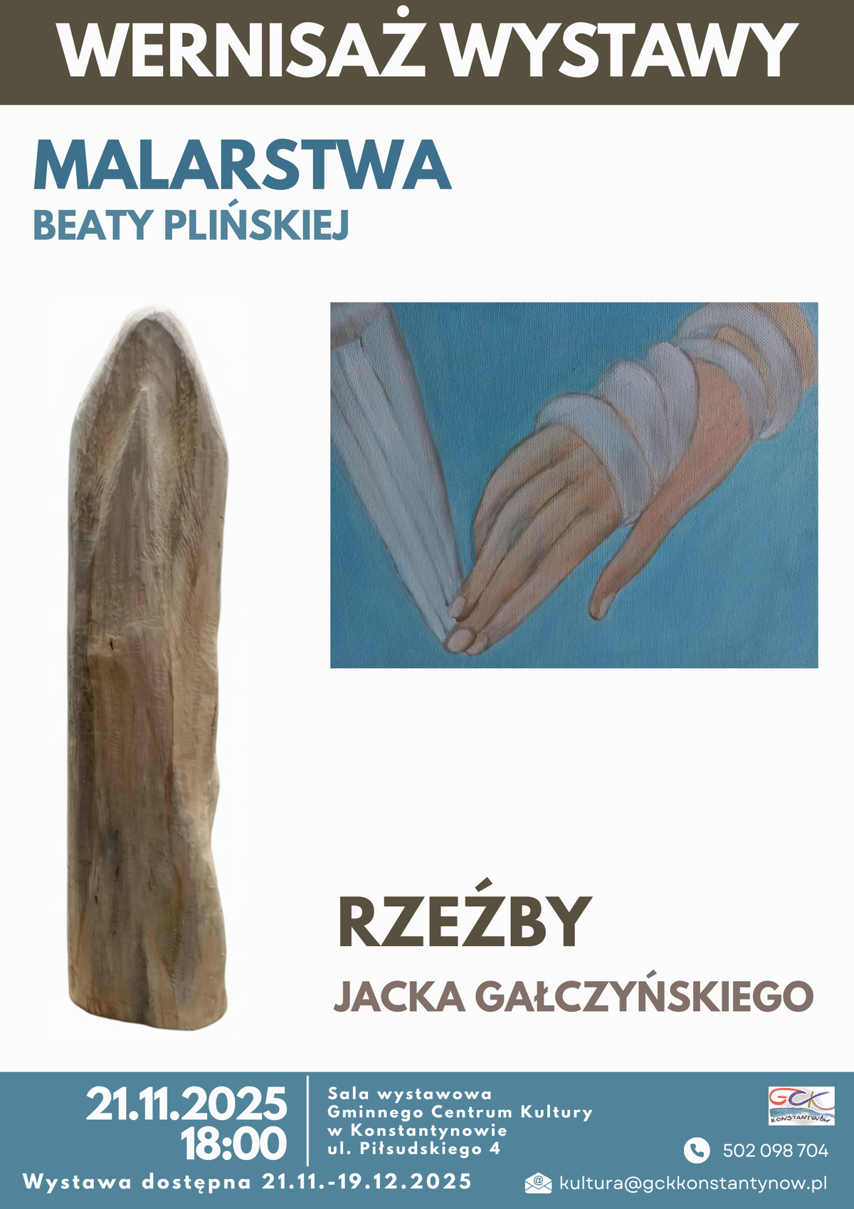 Już 21 listopada o godzinie 18:00 w sali wystawowej Gminnego Centrum Kultury w Konstantynowie odbędzie się wernisaż wystawy malarstwa Beaty Plińskiej oraz rzeźby Jacka Gałczyńskiego. Artyści zaprezentują prace pełne emocji, wrażliwości i refleksji nad człowiekiem i naturą. Wystawa będzie dostępna dla zwiedzających do 19 grudnia 2025 roku.