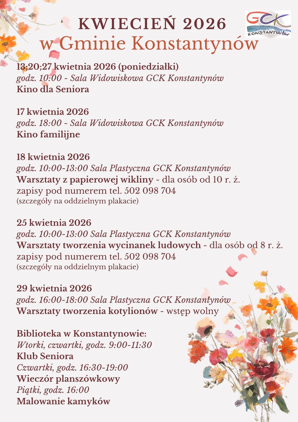 Gminne Centrum Kultury w Konstantynowie przygotowało na kwiecień różnorodny program wydarzeń skierowanych do mieszkańców w każdym wieku. Wśród propozycji znalazły się seanse filmowe, warsztaty artystyczne oraz stałe zajęcia organizowane w bibliotece.