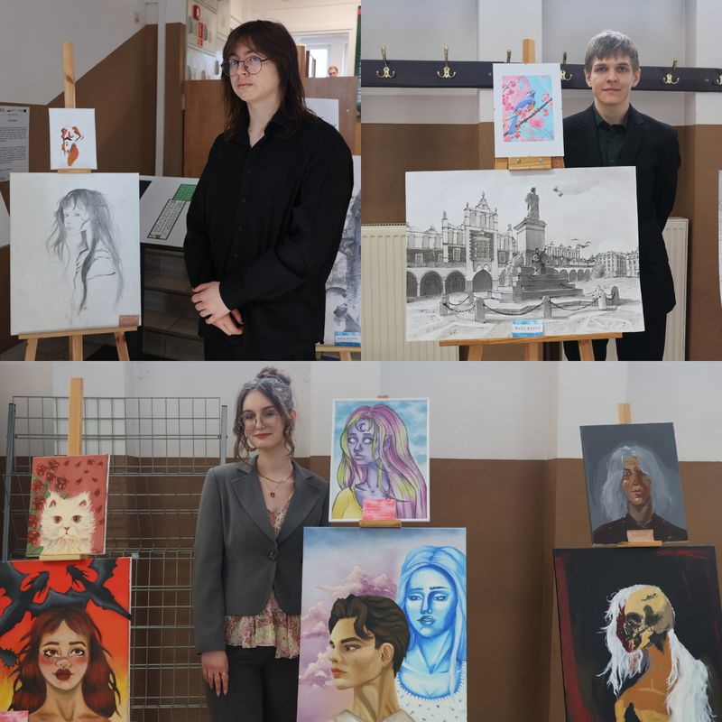 Diana Bloch, Mateusz Klimczuk i Rafał Kociel, to młodzi ludzie z ogromną pasją i niezwykłym talentem. Każdy z nich ma swój unikalny styl, ale łączy ich jedno – ogromne zamiłowanie do malarstwa i chęć dzielenia się swoją wrażliwością. Prezentowane obrazy przedstawiają zarówno realistyczne portrety i pejzaże, jak i abstrakcyjne wizje, w których można dostrzec głębokie emocje i refleksje nad światem.Licealiści nie ukrywają, że sztuka to dla nich coś więcej niż tylko hobby. Malarstwo pomaga im rozwijać się, uczy cierpliwości i pozwala być bardzo kreatywnymi i odważnymi osobami. Talent, który rozwijają otwiera przed nimi również możliwość, do spełniania marzeń i być może, wyboru ścieżki artystycznej, jako drogi, z którą zwiążą swoją przyszłości.