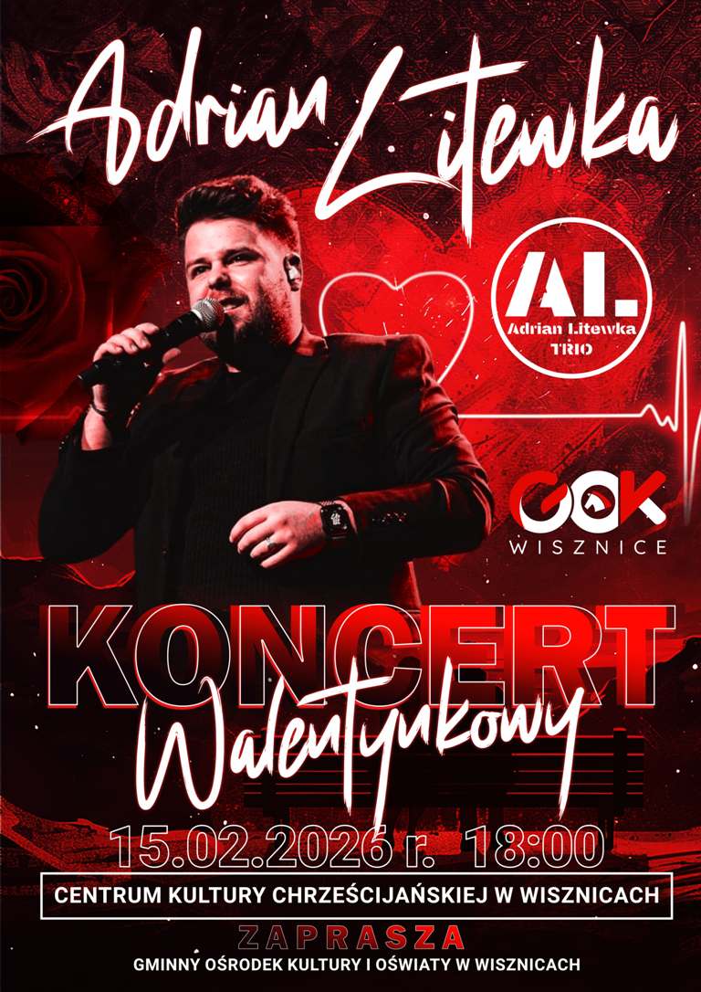 Miłość ma swój dźwięk… A w walentynkowy wieczór zabrzmi on w wyjątkowym wykonaniu Adriana Litewki. Gminny Ośrodek Kultury i Oświaty w Wisznicach zaprasza na koncert pełen ciepłych emocji, wzruszeń i muzyki, która łączy serca.