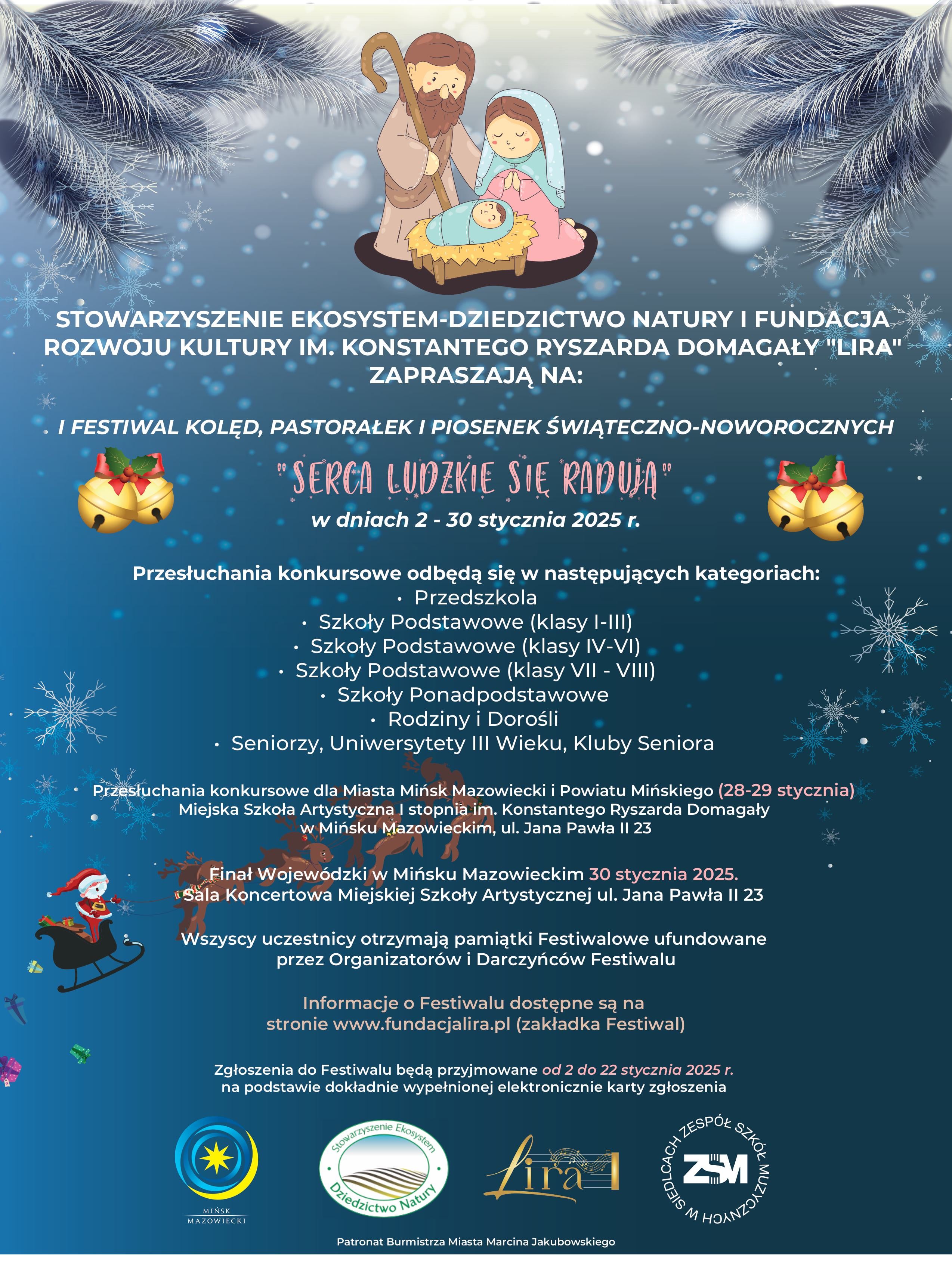 Trwają zgłoszenia do Festiwalu Kolęd, Pastorałek i Piosenek Świąteczno-Noworocznych "Serca Ludzkie Się Radują". Do 22 stycznia można się zarejestrować na stronie www.fundacjalira.pl (zakładka Festiwal).