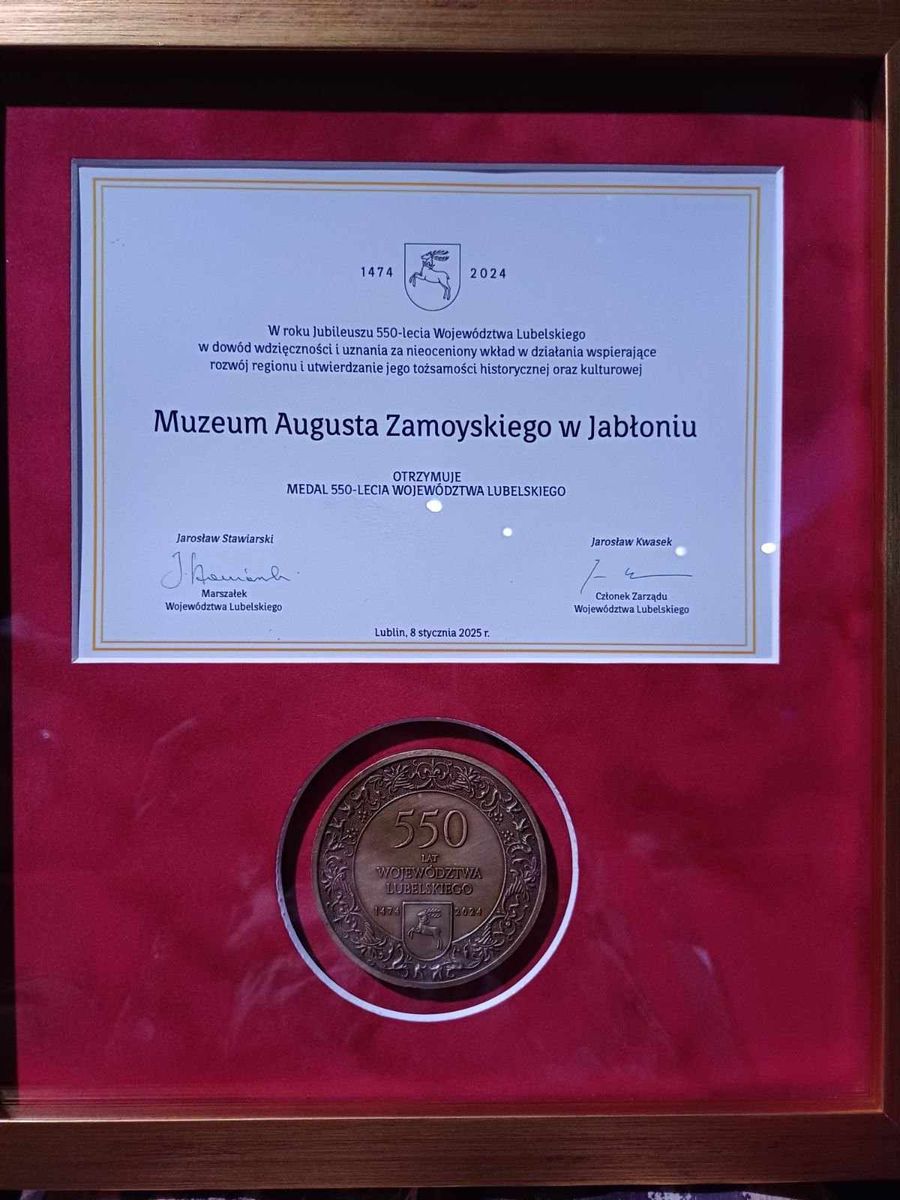 Pamiątkowe medale z insygniami województwa zostały wręczone 8 stycznia w Centrum Spotkania Kultur w Lublinie przedstawicielom jednostek, które zaangażowane są w rozwój regionu, zachowanie jego tożsamości historycznej, kulturowej, religijnej i ochrony środowiska. Wśród odznaczonych znaleźli się naukowcy, samorządowcy, regionaliści, krajoznawcy, a także osoby duchowne. W imieniu Muzeum Augusta Zamoyskiego w Jabłoniu, z rąk Marszałka Województwa Lubelskiego Jarosława Stawiarskiego, odznaczenie odebrała dyrektor placówki Barbara Wikło.- Ten medal dla muzeum, to jest medal dla dyrektor Pani Barbary Wikło, ponieważ ta cała działalność, która tutaj się dzieje wokół Augusta Zamoyskiego to jest jej ponad czterdziestoletnie dreptanie do różnych urzędów i do różnych ludzi. Czasem była przyjmowana serdecznie, niektórzy zaś niechętnie do tematu podchodzili, ale Pani Basia ma dalej taki zapał do tej działalności, dlatego uważam, że jest to medal dla niej. Dodatkowo zostaliśmy zauważeni, bo w listopadzie ubiegłego roku minęło 30 lat od czasu powstania izby pamięci Zamoyskiego. Właśnie w grudniu mieliśmy zorganizowaną taką dużą imprezę połączoną z Ogólnopolską Wigilią Towarzystwa Uniwersytetów Ludowych, ponieważ TUL miał ogromne zasługi w fakt, że najpierw była izba, a potem powstało muzeum – podkreśla Irena Mospinek, kustosz.