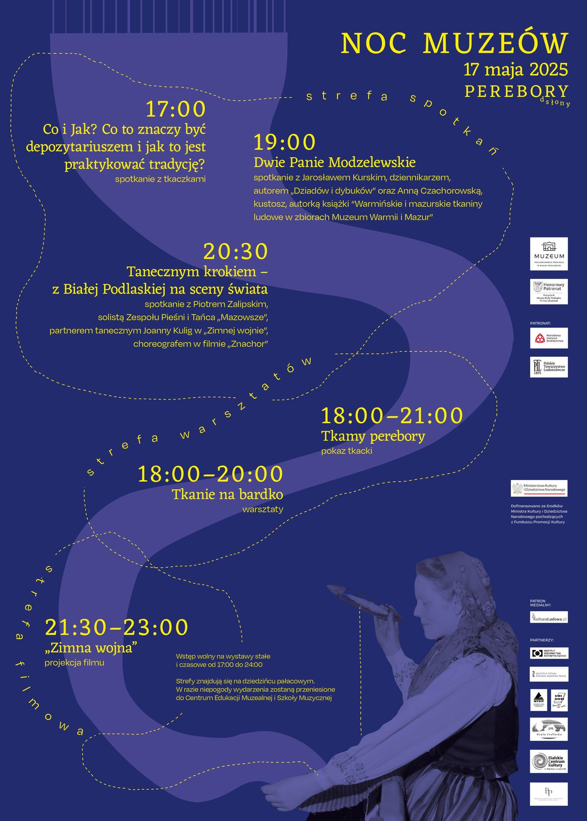 17 maja od godziny 17:00 do 24:00 uczestnicy tegorocznej edycji będą mieli możliwość odkryć magię Nocy Muzeów w wyjątkowej opowieści utkanej z tradycji, spotkań i filmowych emocji. Wszyscy chętni będą mogli poznać świat misternie tkanych wzorów, kolekcji i kolekcjonerów, spotykając twórców i pasjonatów, którzy podzielą się historiami dawnych mistrzyń, muzealnymi odkryciami, rodzinnymi opowieściami i estradowymi emocjami. Uczestnicy Nocy Muzeów będą mogli sami spróbować tkactwa, odwiedzić wystawy w Muzeum Południowego Podlasia, a na zakończenie obejrzeć poruszającą opowieść filmową „Zimna wojna”.Jak obiecują organizatorzy, będzie to „jedyna taka noc, gdy muzeum zatętni rozmowami, kreatywną energią i kinem – bądźcie z nami 17 maja od zmierzchu do północy! Przygotowaliśmy trzy strefy, w których przez spotkania, warsztaty i film odkryjemy kolejne wątki opowieści o pereborach”.