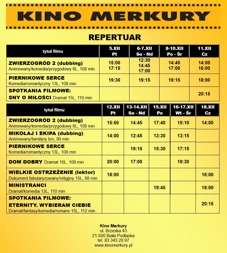 Z aktualnym harmonogramem seansów można zapoznać się na stronie internetowej kina: