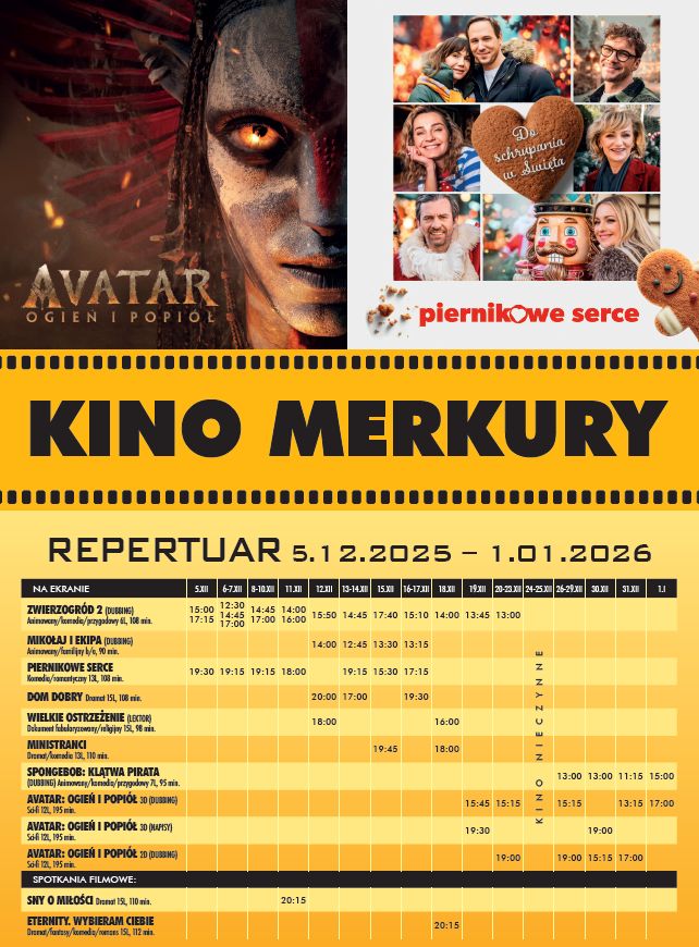 Nowy repertuar obejmuje zarówno propozycje dla dorosłych widzów, jak i produkcje familijne oraz filmy dla najmłodszych. Jak podkreślają przedstawiciele instytucji, Kino Merkury stawia na aktualne hity kinowe, ale również na wartościowe obrazy europejskie i polskie, które trafiają do szerokiego grona odbiorców.