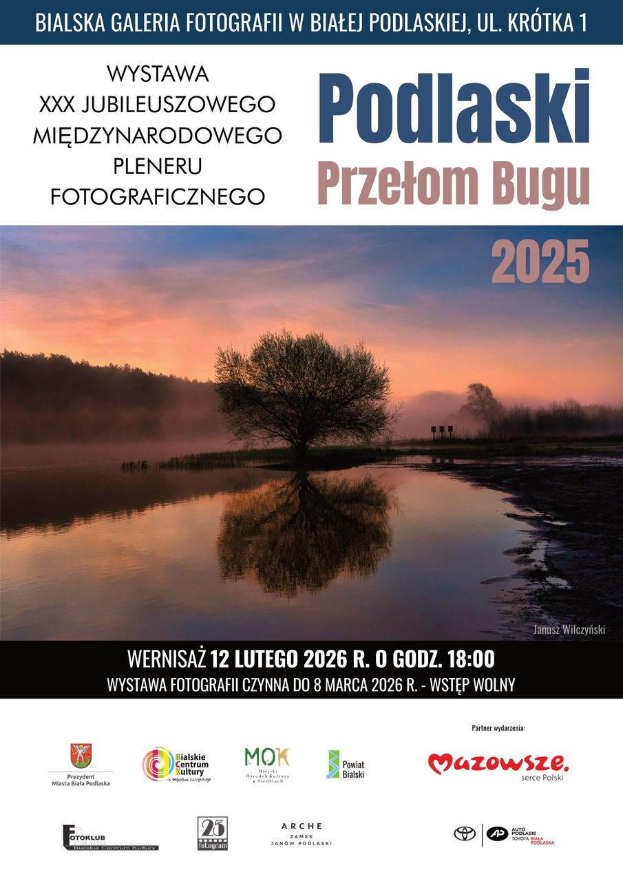 Międzynarodowy Plener Fotograficzny „Podlaski Przełom Bugu" to projektu, który przez lata stał się jednym z najważniejszych wydarzeń fotograficznych w naszym regionie. Prace, które będzie można obejrzeć na wystawie są zapisem spotkania z nadbużańskim krajobrazem – miejscem pozornie skromnym, pozbawionym dosłowności, opartym na prostocie formy i naturalnym rytmie miejsca, a jednocześnie niezwykle autentycznym.Plener odbywał się w dniach 22–26 października ubiegłego roku w Janowie Podlaskim. Wzięło w nim udział 45 aktywnie fotografujących artystów z całej Polski oraz goście z Ukrainy i Szkocji. Powstałe w tym czasie fotografie są osobistą refleksją nad trwaniem, przemijaniem i uważnym patrzeniem. To próba zanurzenia się w polskiej prowincji – w krajobrazie, emocjach i ciszy – bez porównań i ocen, z otwartością na to, co nieoczywiste, ale prawdziwe.