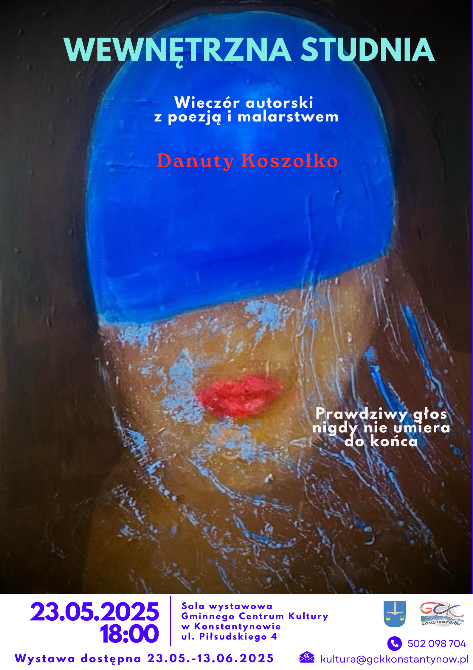 W Gminnym Centrum Kultury w Konstantynowie zaprezentowana zostanie wystawa poetycko-malarska Danuty Koszołko zatytułowana „Wewnętrzna studnia”. Otwarcie odbędzie się 23 maja o godz. 18:00 w sali wystawowej placówki przy ul. Józefa Piłsudskiego 4.