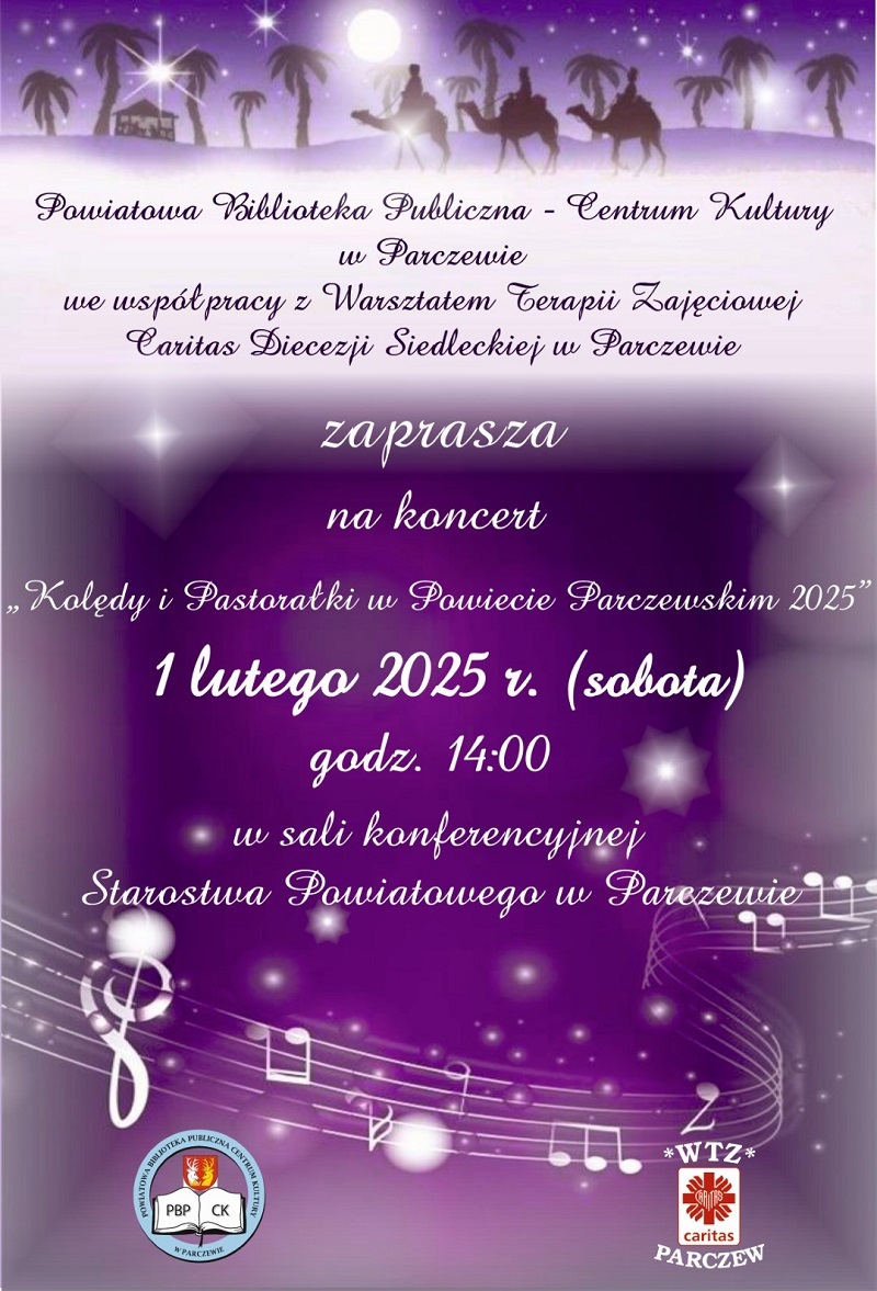 Powiatowa Biblioteka Publiczna - Centrum Kultury w Parczewie oraz Caritas Diecezji Siedleckiej Warsztat Terapii Zajęciowej w Parczewie organizują koncert „Kolędy i Pastorałki w Powiecie Parczewskim 2025”.