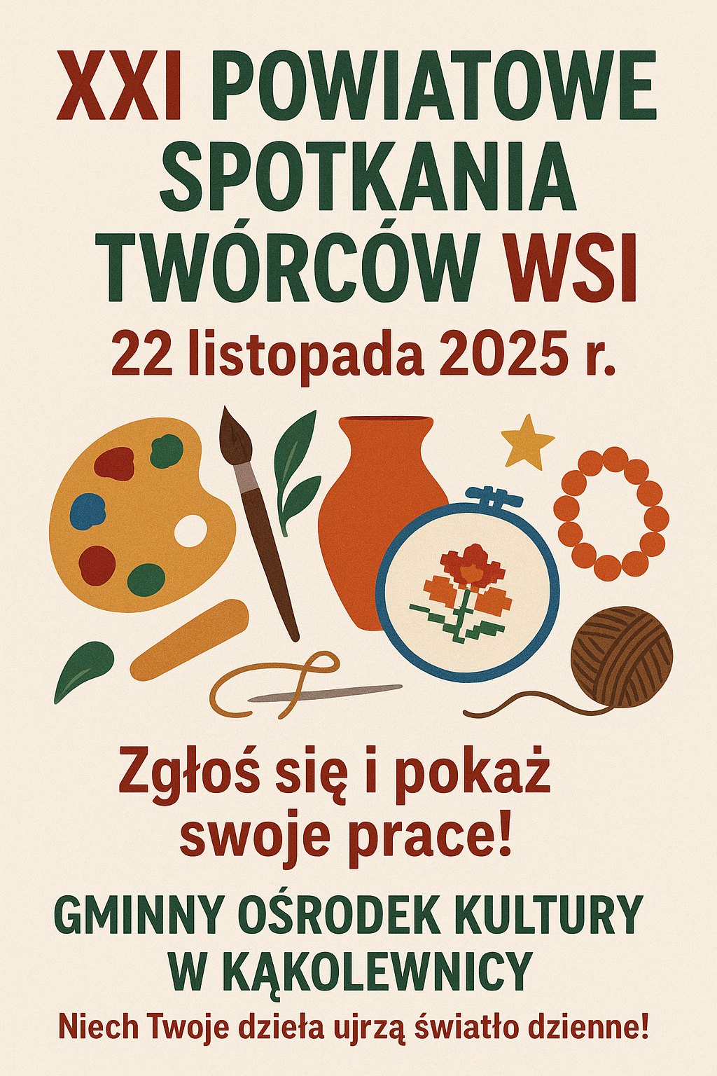 Już po raz XXI odbędą się Powiatowe Spotkania Twórców Wsi, organizowane przez Gminny Ośrodek Kultury w Kąkolewnicy. To wyjątkowe wydarzenie, które co roku przyciąga artystów i twórców z całego powiatu, stwarzając im doskonałą okazję do zaprezentowania swojej pracy oraz wymiany doświadczeń.