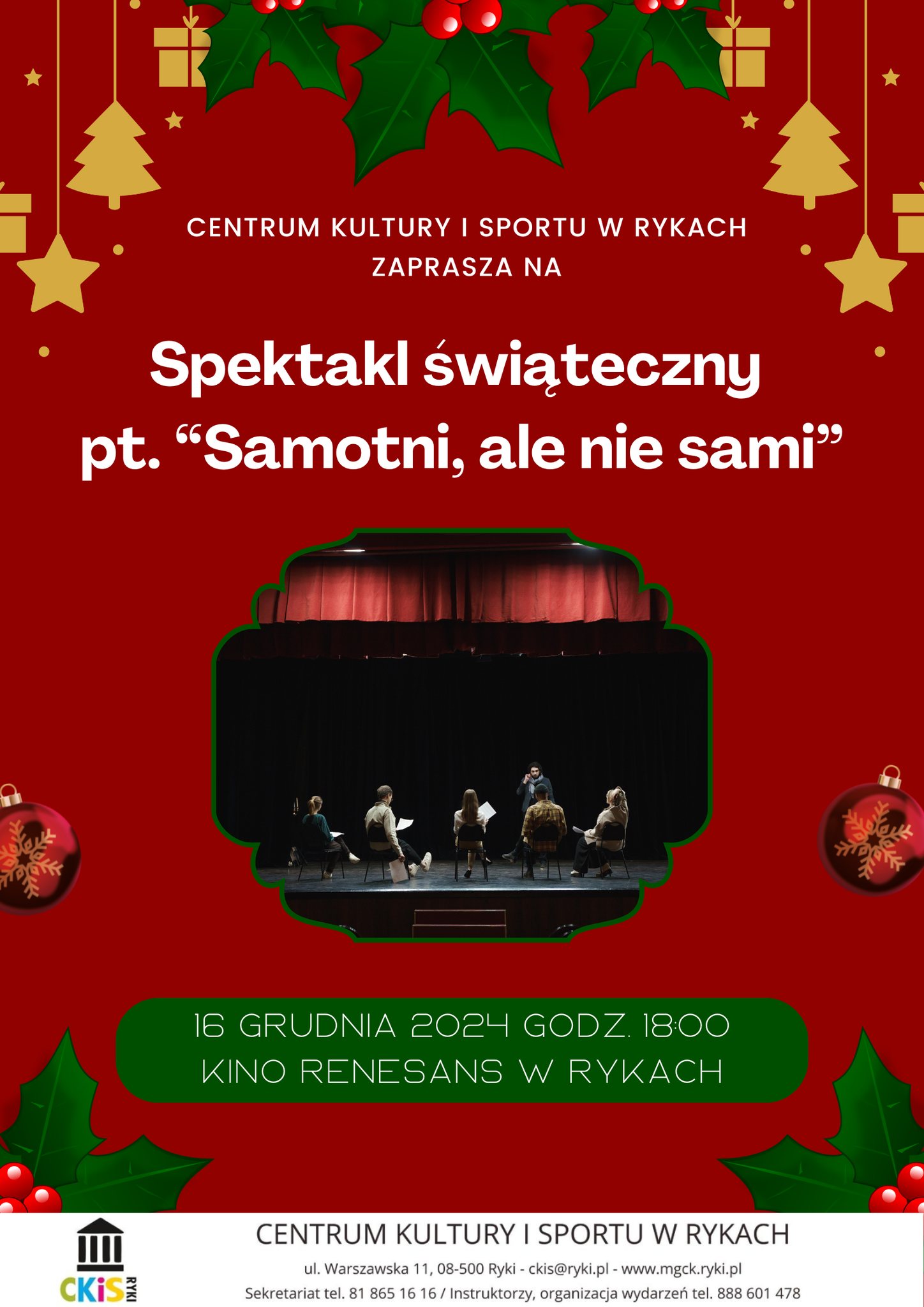 W Rykach odbędzie się niecodzienny spektakl pt. „Samotni, ale nie sami”. Przedstawienie zostało przygotowane przez grupy artystyczne działające przy miejscowym Centrum Kultury i Sportu i porusza temat samotności oraz problemów, z jakimi wielu ludzi zmaga się w okresie Bożonarodzeniowym.