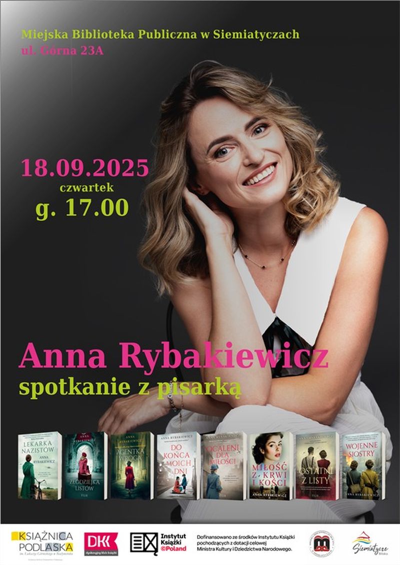 Anna Rybakiewicz, autorka bestsellerowych powieści obyczajowych, zagości w Miejskiej Bibliotece Publicznej w Siemiatyczach. Autorka takich powieści, jak „Lekarka nazistów”, „Złodziejka listów”, „Agentka wroga”, „Do końca moich dni” czy „Wojenne siostry” będzie gościem biblioteki w czwartek, 18 września.