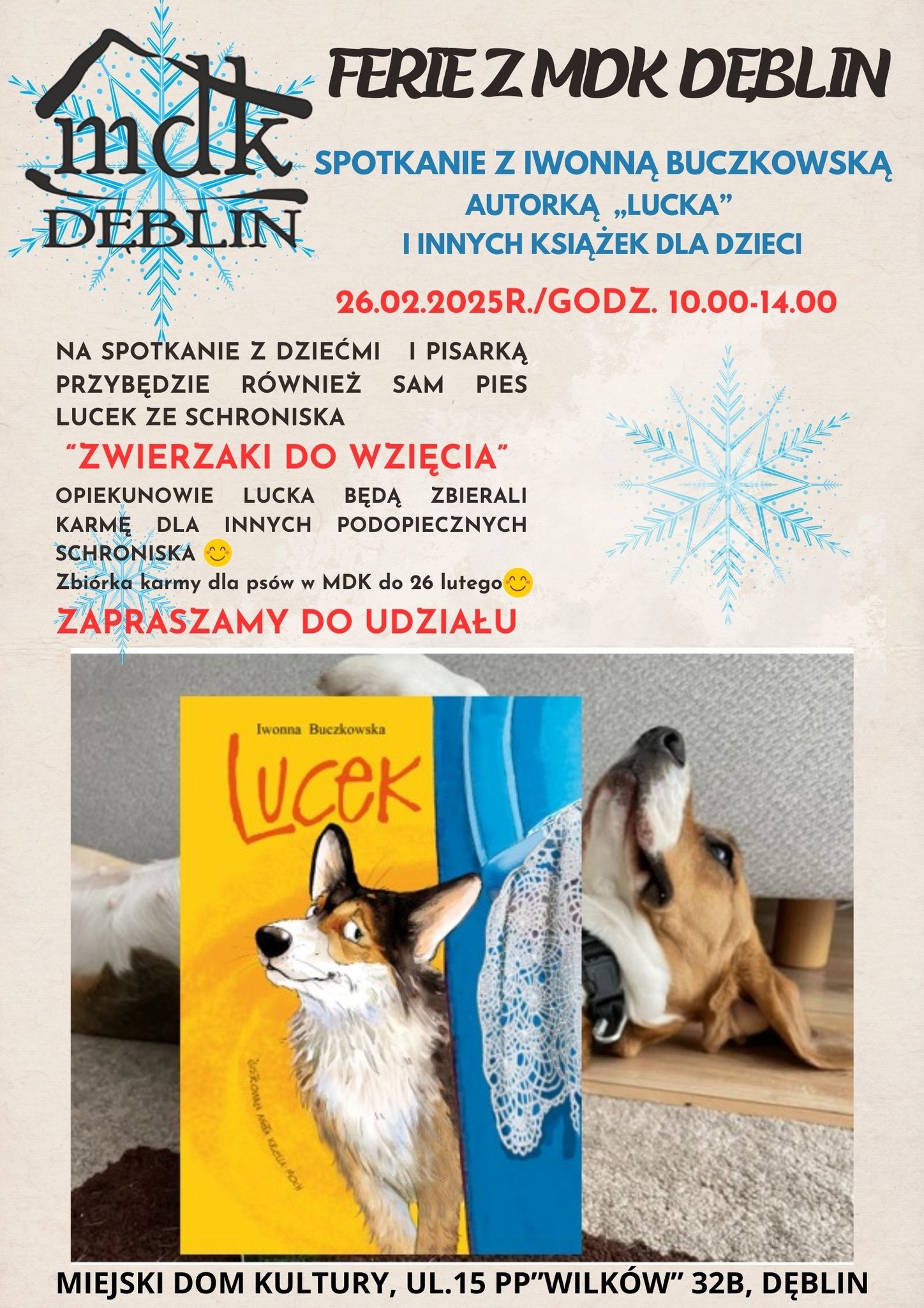 Podczas spotkania, które odbędzie się 26 lutego w godz. 10:00-14:00, dzieci i rodzice będą mieli okazję nie tylko spotkać się i porozmawiać z pisarką, ale także poznać Lucka, psa ze schroniska, który stał się inspiracją dla książki. Lucek oraz opiekunowie zwierzęcia będą obecni na miejscu.Oprócz spotkania z autorką, zorganizowana zostanie zbiórka karmy dla zwierząt ze schroniska. Wszyscy chętni mogą przynieść karmę dla psów, która będzie zbierana w MDK aż do dnia wydarzenia.